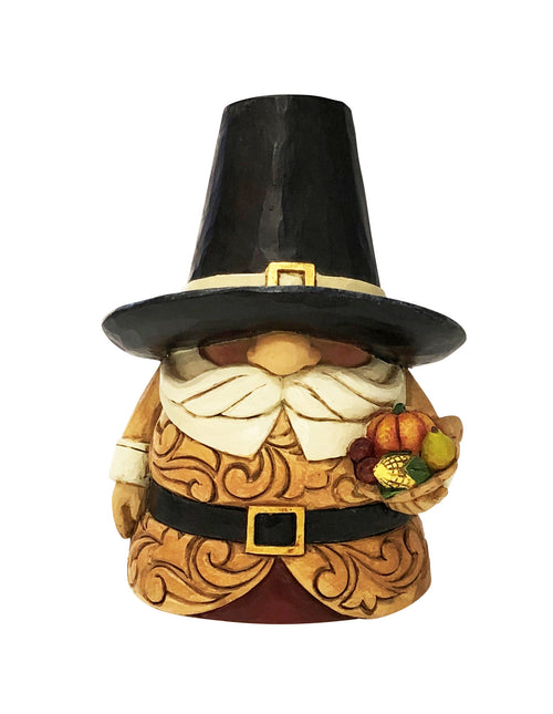 This gnome of our forefathers is called "Harvest Wishes." This charming pilgrim by Jim Shore wears a large buckle hat over his eyes with a large belt and rosemaling tunic. With a red nose, rosy cheeks, and mustache, this settler happily presents an overflowing cornucopia for your Thanksgiving table.