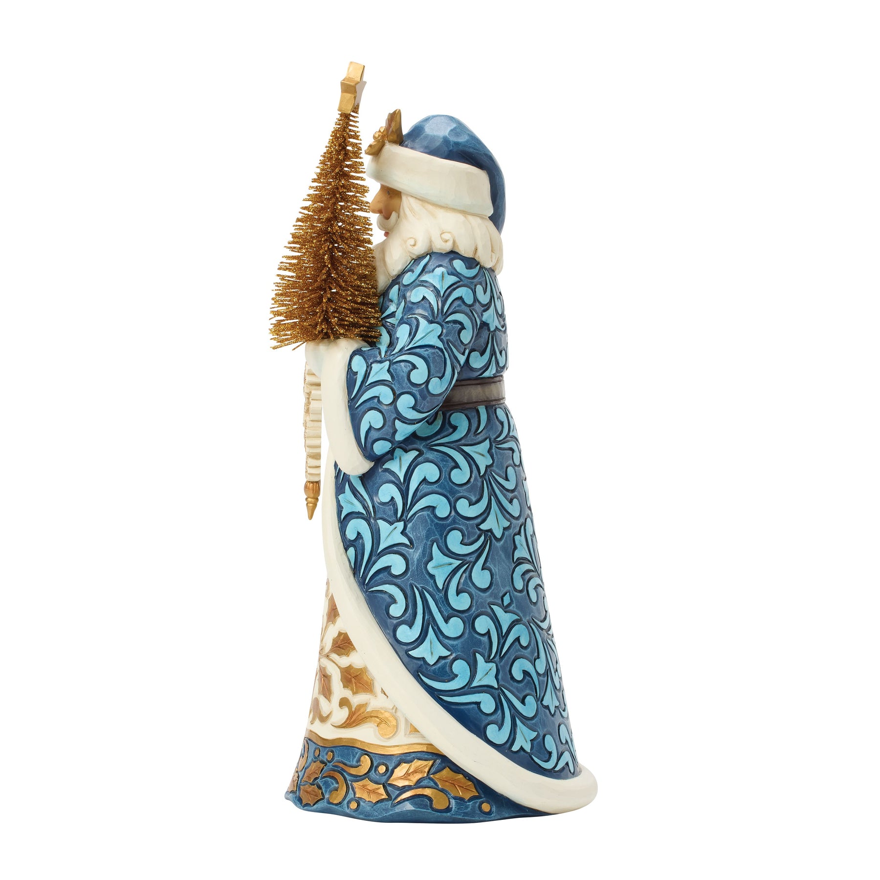 Dressed in twilight blues and striking golds, this regal Santa carries a sisal tree and snowflakes. Jim Shore's cool tones and intricate designs inspire elegant winter magic. Add a refined touch to your seasonal home decor.
