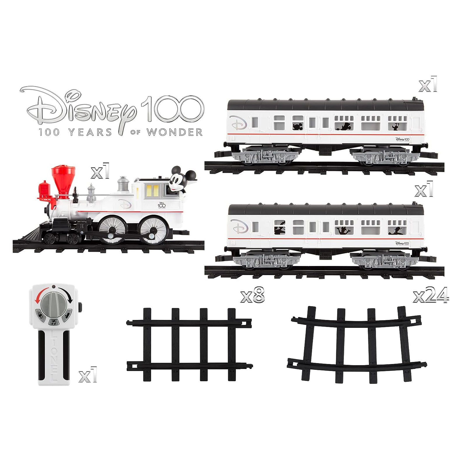 Join us as we celebrate Disney 100 Years of Wonder with this beautiful Disney100 Celebration Ready-To-Play train set. This fun battery-operated set features window silhouettes of the beloved Sensational Six and is sure to bring hours of fun and imagination to your home. Lionel Trains has a unique and wonderful past with Walt Disney himself. His love of trains knew few boundaries; and we honor and cherish the legacy of all things Disney with the hopes of inspiring future generations to share in Walt’s extraordinary creative vision.