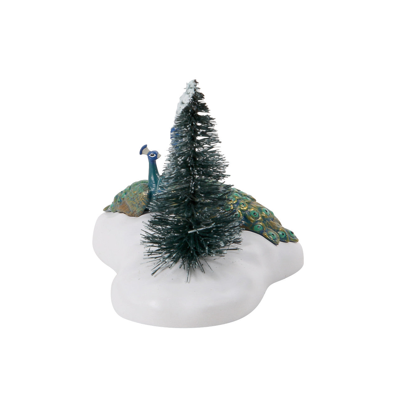 Proud and vibrant, these peacocks display their colorful feathers against a serene snowy backdrop.