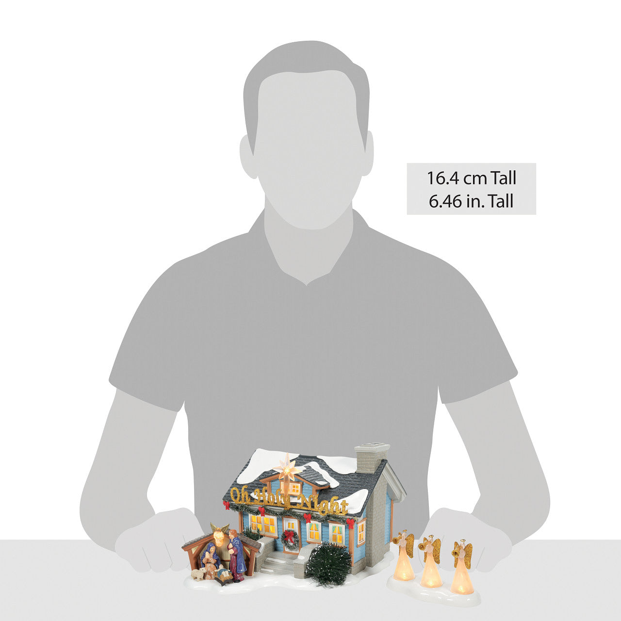 A beautiful LED lit star shines over the house and guides visitors to the large nativity in the front yard of the "O Holy Night" house, the latest addition to the festive "Christmas Lane series. A trio of decorated angels complete the scene.