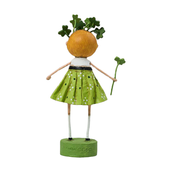 Lori Mitchell's Sweet Clover Figurine is a whimsical and charming addition to any Spring decor collection. This enchanting figurine depicts a sweet and friendly girl wearing a green polk-a-dot skirt and black belt with gold buckle. She holds a four-leaf clover with matching clovers in her hair.