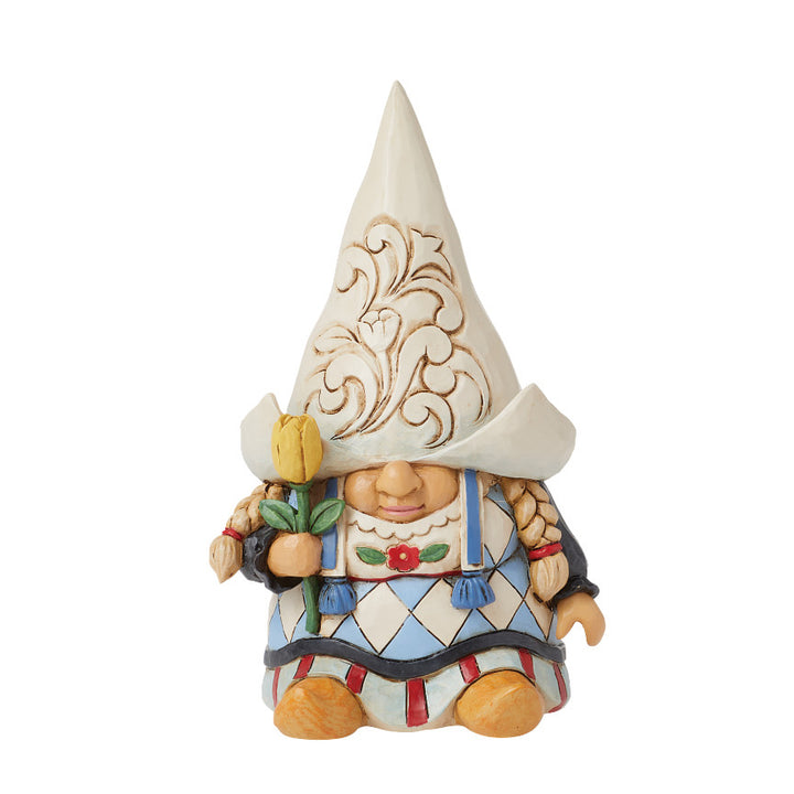 No one knows gnomes quite like Jim Shore! This Gnome Around the World depicts a charming Dutch girl adorned in traditional attire, with a flower-patterned bonnet and blonde braids. Wooden clogs add to her quaint charm as she holds a flower to honor Dutch culture and history.