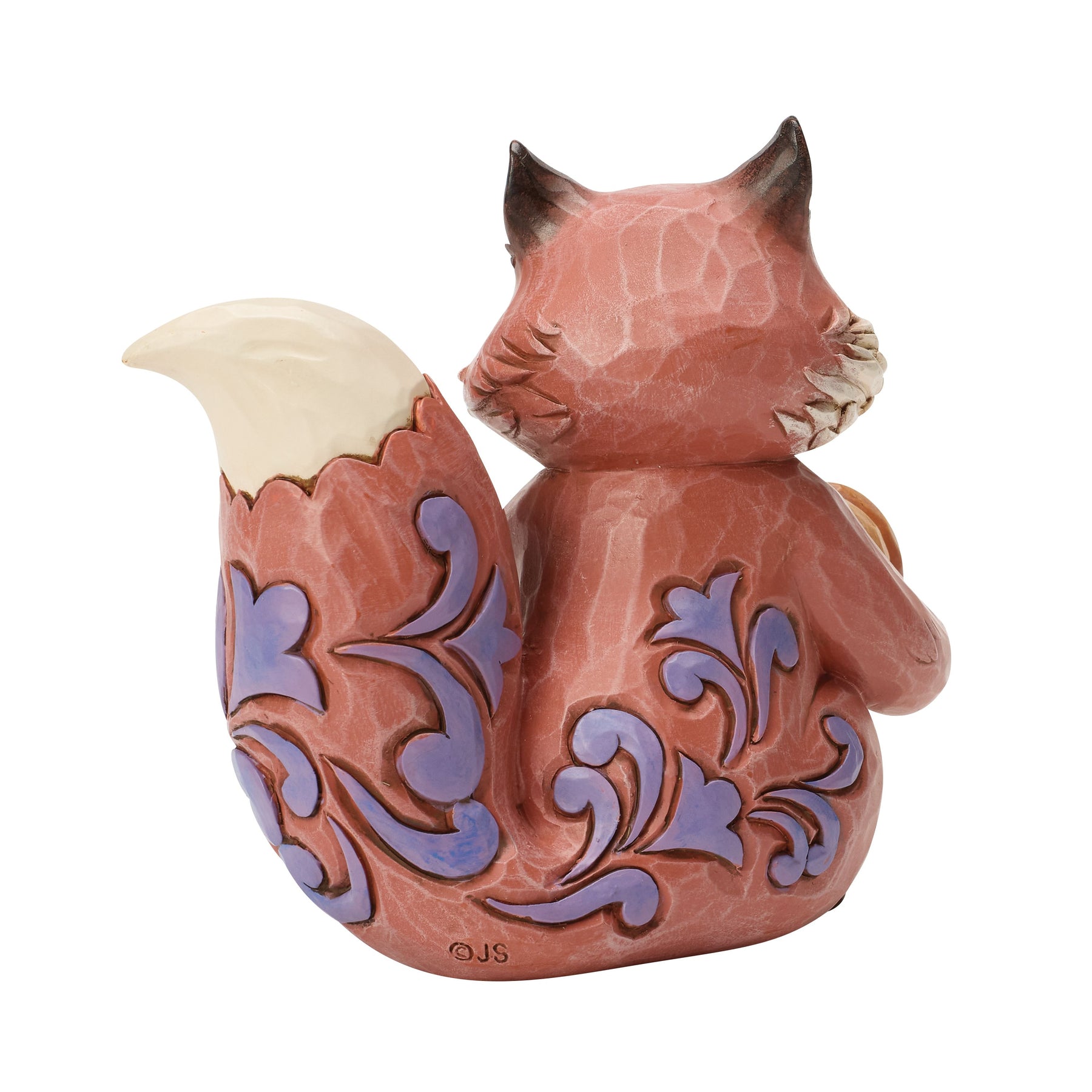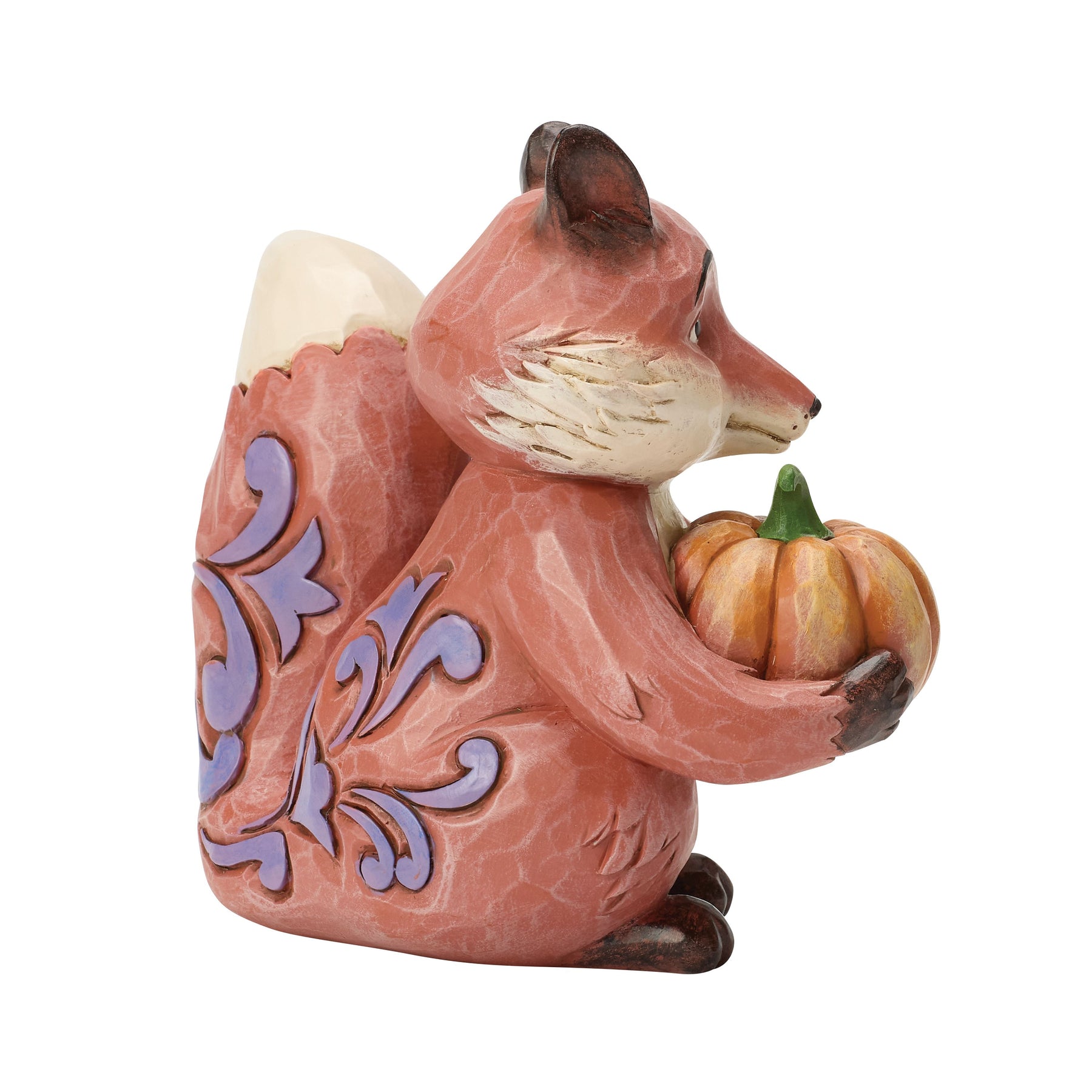 This sweet Jim Shore fox carries a cheerful pumpkin with a bright smile, dressed in purple patchwork and intricate rosemaling patterns. With a warm invitation, he's ready to share in the joys of the harvest season with you.