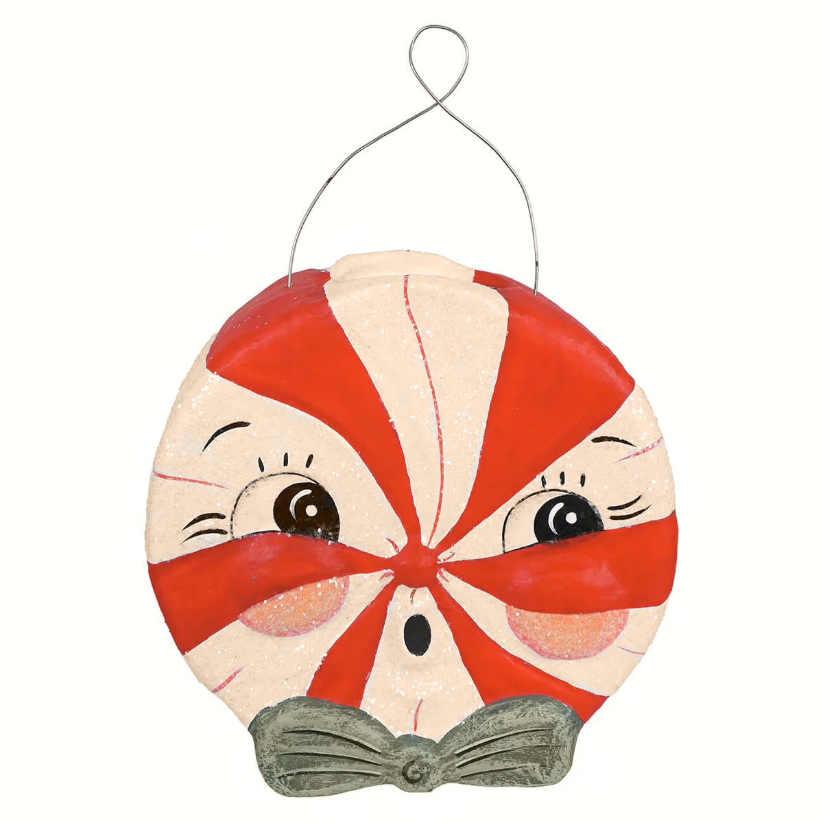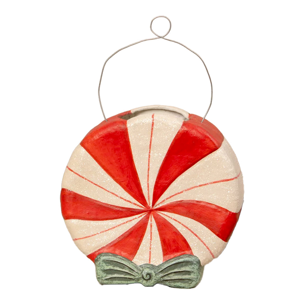 This Merrymint bucket, by Johanna Parker, serves as a charming and functional decor item, ideal for holding small treats or as a delightful centerpiece during the holiday season. The paper mache adds a vintage touch to the piece, evoking a sense of nostalgia. With its cheerful design and handmade appeal, it adds a touch of festive charm to any home or holiday celebration.