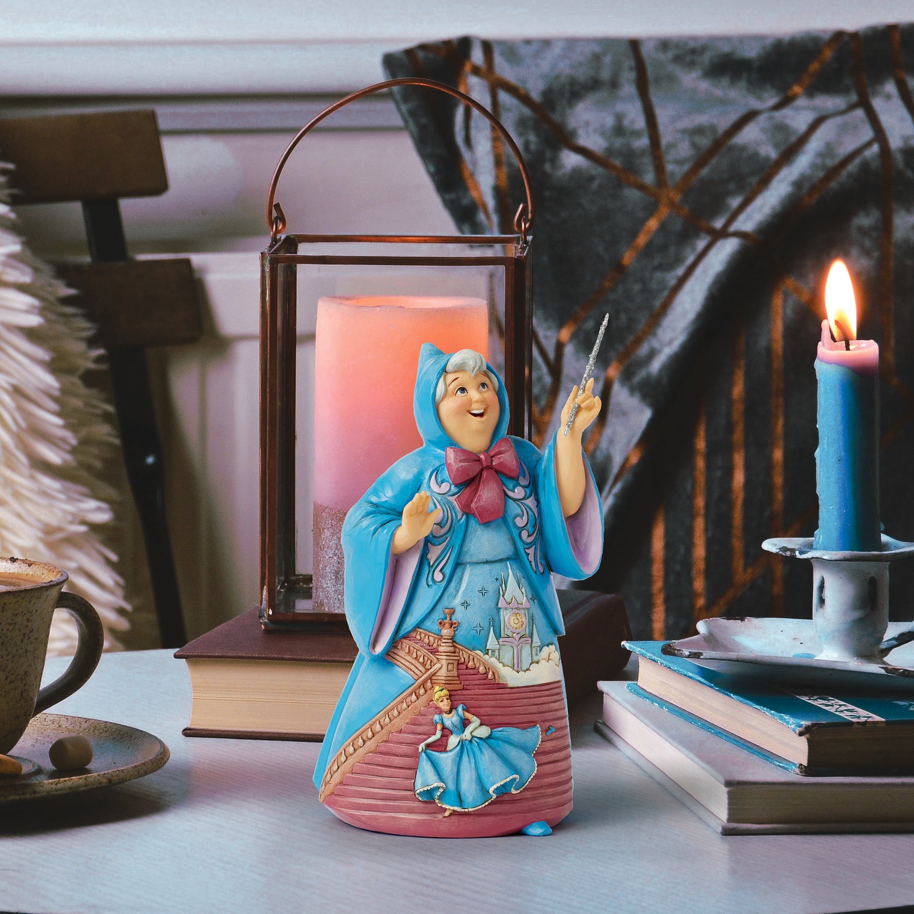 In this magical Jim Shore design, the Fairy Godmother smiles with her wand, her rosemaling blue robes parting to reveal Cinderella racing down the steps as the clock strikes midnight. This captivating moment is when she will lose her glass slipper.