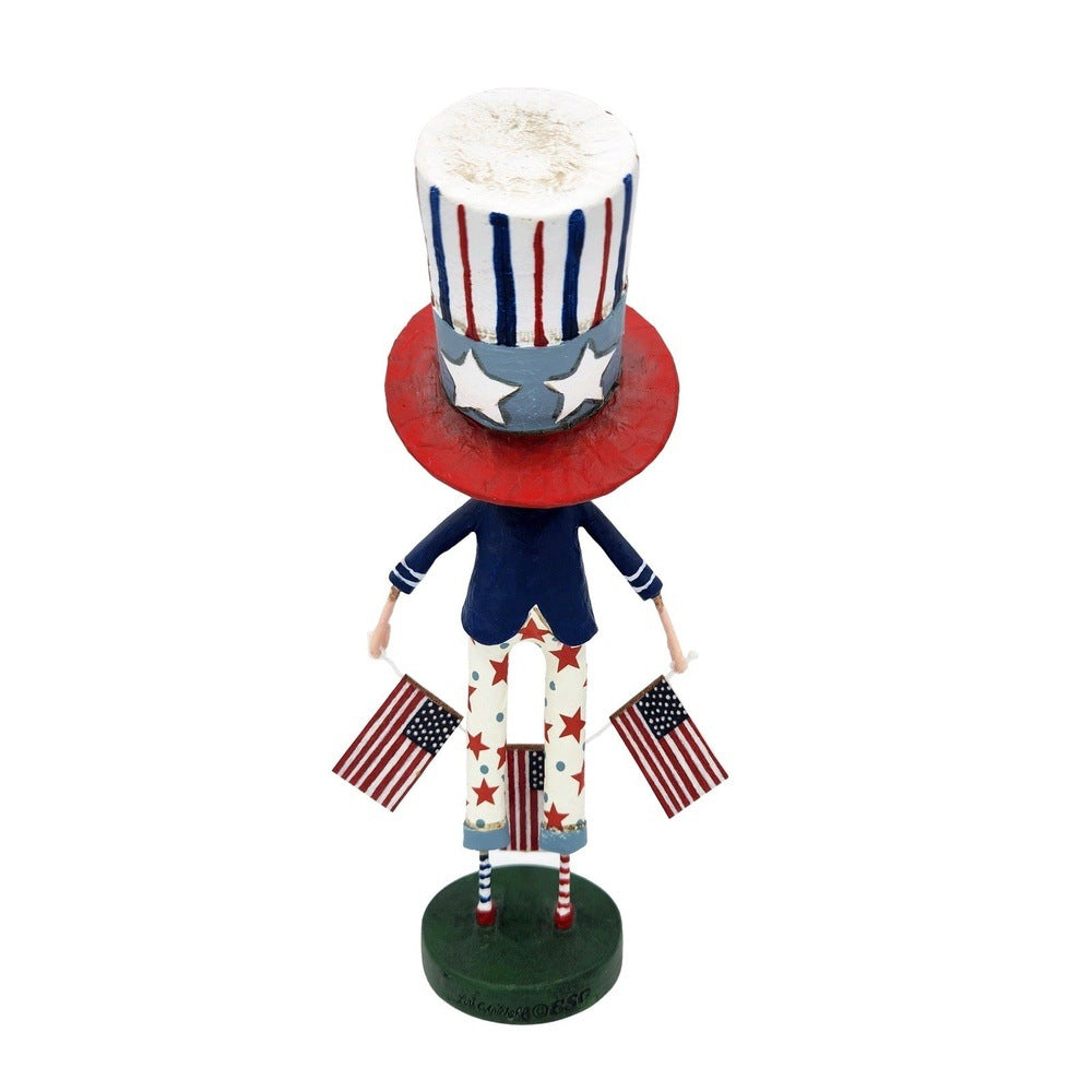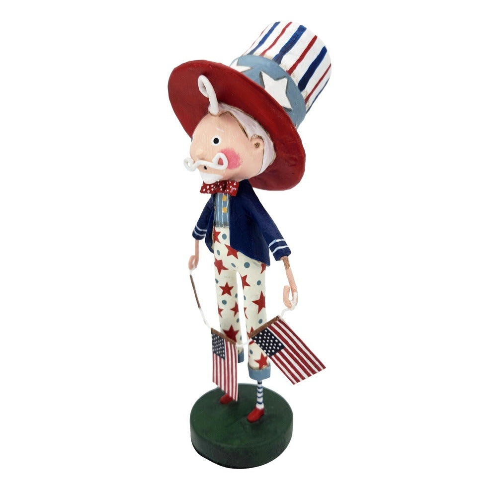 "Oh say does that star-spangled banner yet wave" is more than just a lyric to him, it's a whole way of life. Wearing patriotic colors, red-white-and-blue, and star studded pants, this Uncle Sam impersonator is complete with white mustache, goatee, and and top hat. Carrying an American flag garland, he represents the land of the free and the home of the brave.