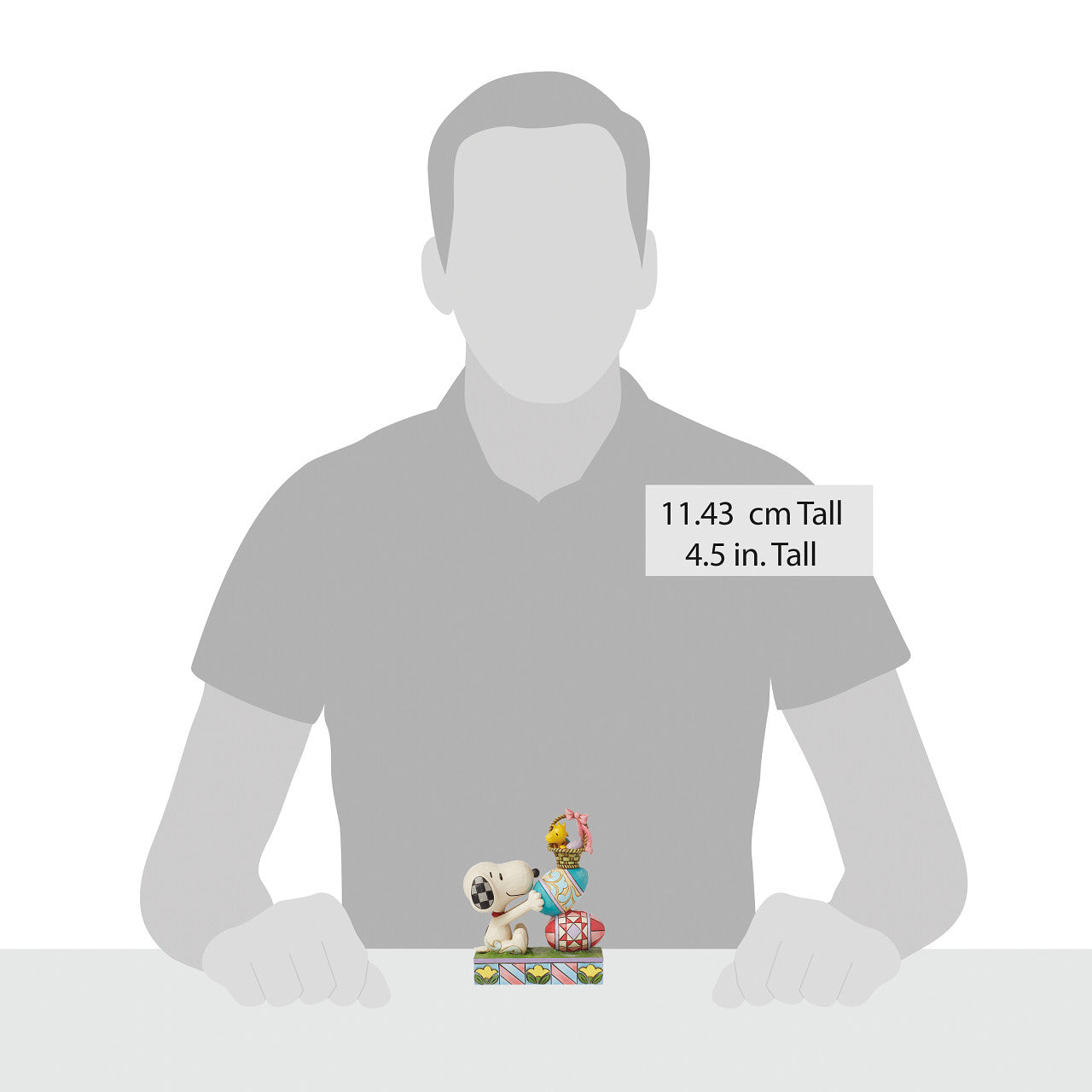 In this charming Jim Shore creation, Snoopy stacks intricately patterned Easter eggs while Woodstock balances atop them inside a basket, enjoying the festive scene below. Jim Shore's details capture the whimsy and joy of Easter and the Peanuts.