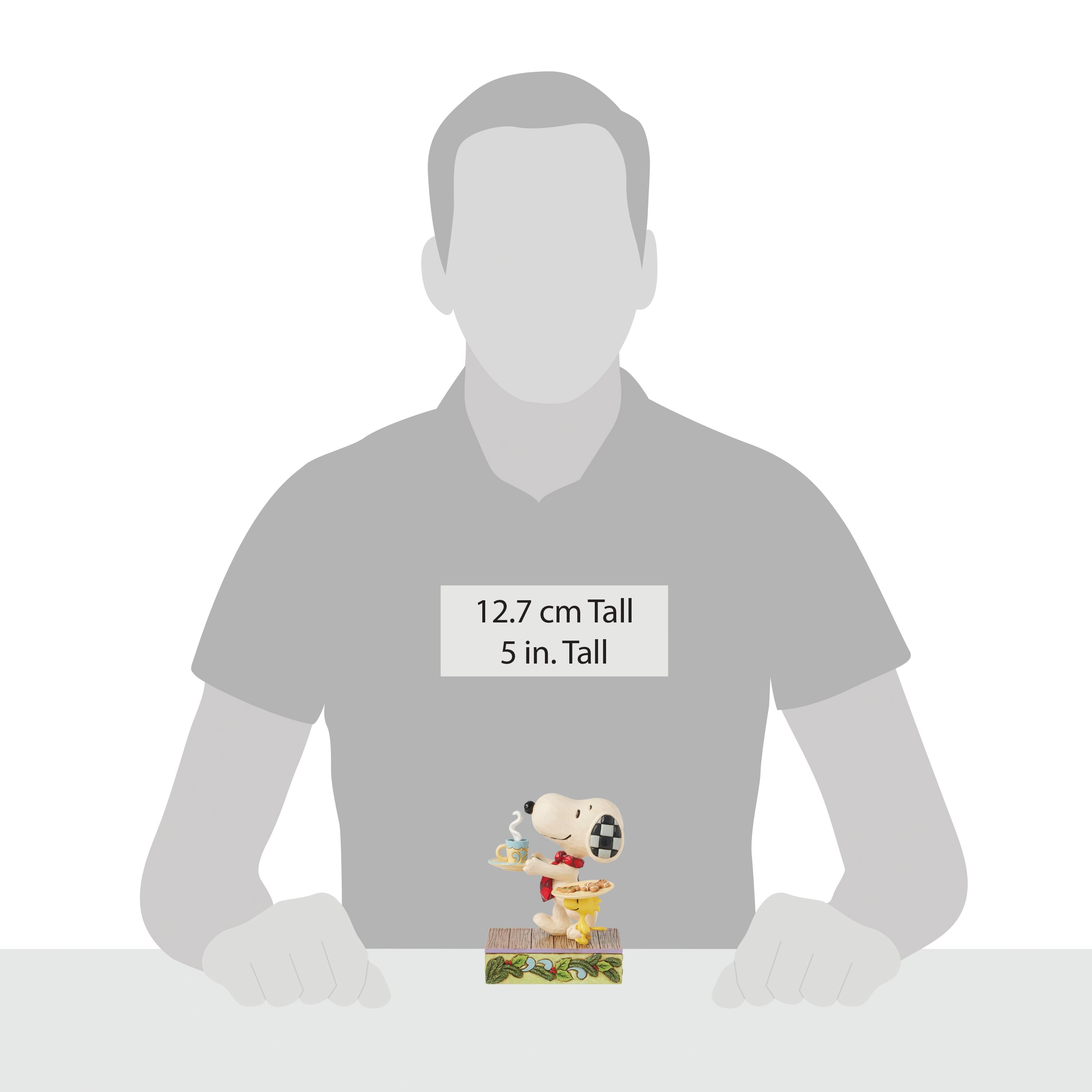 Spread holiday cheer with this delightful Jim Shore design of Snoopy and Woodstock preparing a festive treat for Santa. Snoopy carries a glass of warm milk, while Woodstock balances a plate of fresh Christmas cookies atop his head.
