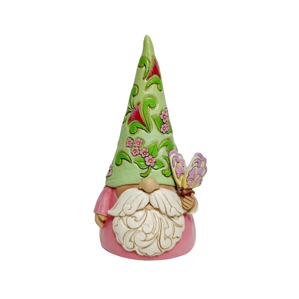 For centuries, gnomes have been symbols of good luck. Often placed in gardens, they are thought to provide protection with their delightful charm. This Jim Shore gnome wears a floral patterned hat as he cheerfully holds a butterfly in his hand.