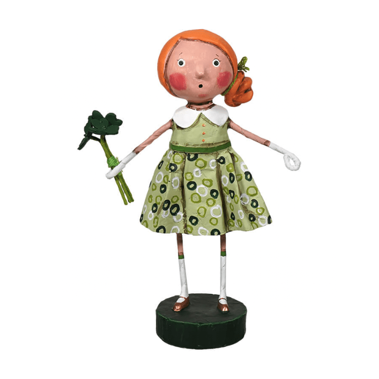 Top o' the morning to ya! This little lass is dressed in her best spring green dress, wearing gold slippers, white gloves, and fiery red hair tied in a side bun with green ribbon. Carrying a bundle of clovers tied in a green ribbon, she offers everyone she meets some Irish luck.