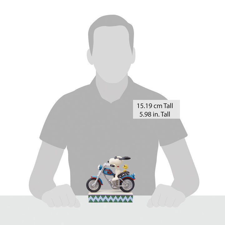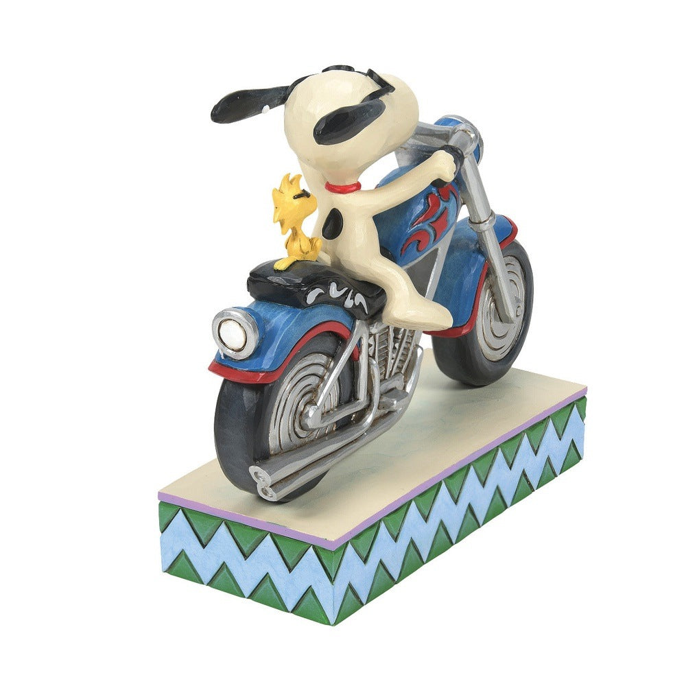 This Peanuts figurine by Jim Shore features the grooviest bikers around! Steering a rosemale motorcycle, Snoopy's ears soar backward in the wind while Woodstock holds tight. Effortlessly cool, the pair wear sunglasses as they speed through town.