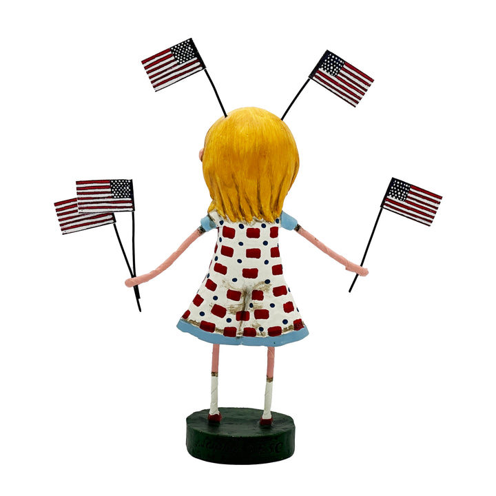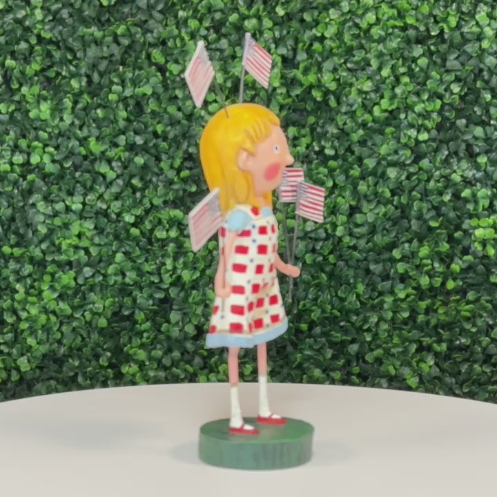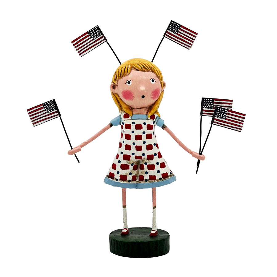 Fannie loves America, and she loves America's flag. This independence day, she hopes to add to her collection. But for now, she is showing off her patriotism with an American themed Red-White-Blue checkered jumper and flags in each hand, even flags in her blonde hair.