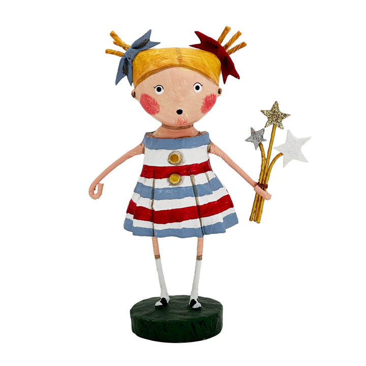 The Lori Mitchell Sissy's Stars Figurine is a delightful and whimsical piece that will add a touch of magic and nostalgia to your space. It stands about 6 inches tall and features a little girl named Sissy wearing a red, white, and blue summer dress, matching hair ribbons, and holding a bouquet of star wands.