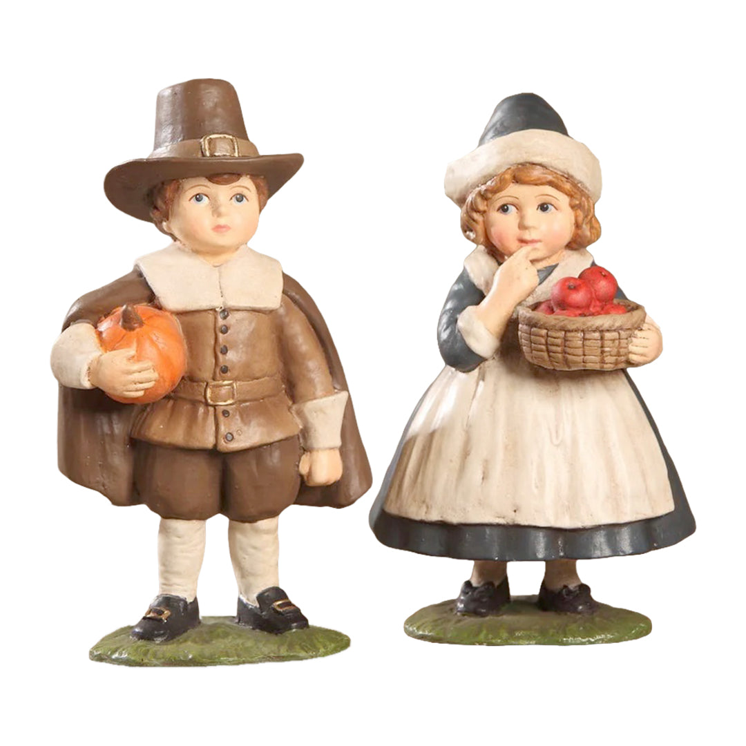 This little baker has baked a pumpkin and apple pie ready for a Thanksgiving feast. Patty is dressed in fall colors and is standing in front of a pumpkin and apples.