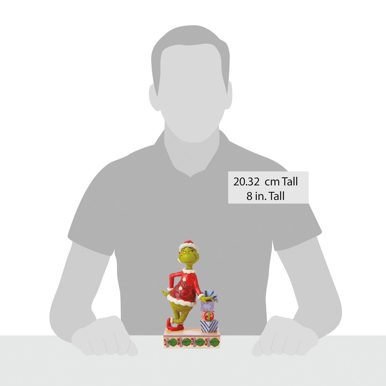 This Jim Shore creation features The Grinch dressed as Santa leaning against a stack of prettily wrapped presents. With his legs crossed, Grinch stands with an attitude and one hand on his hip. Will he steal Christmas or learn to love the season?