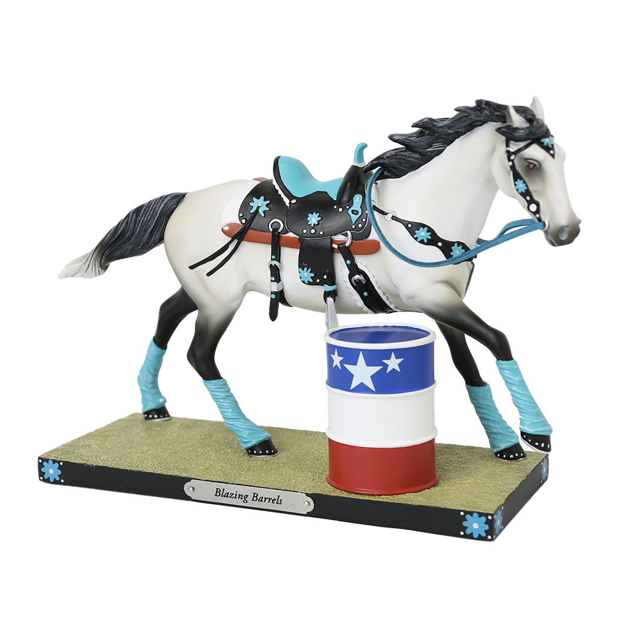 Blazing Barrels by Trail of Painted Ponies captures the fierce elegance of a trotting Appaloosa, adorned with Native American-inspired turquoise accents. By its side, a patriotic barrel in red, white, and blue celebrates heritage and freedom.