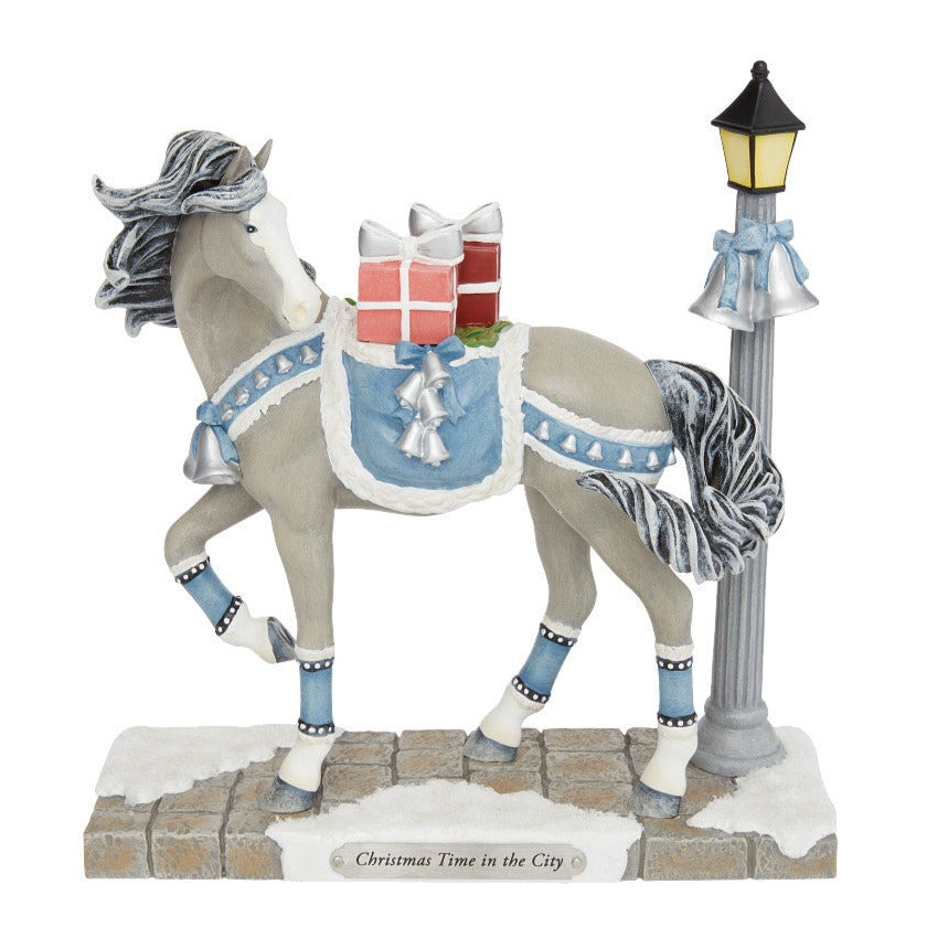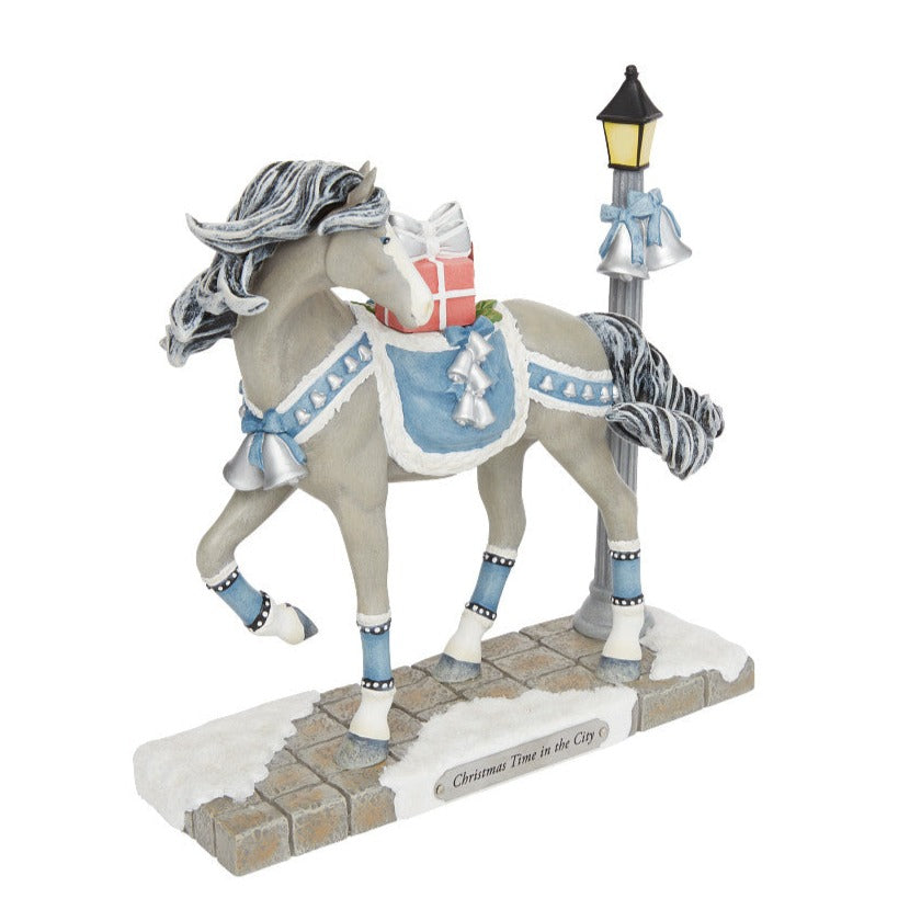 On a cobblestone city street, this silver haired beauty wears bells to deliver presents to the townsfolk. With a blue saddle and matching ankle boots, the steed poses next to a street light in this striking figurine from The Trail of Painted Ponies.