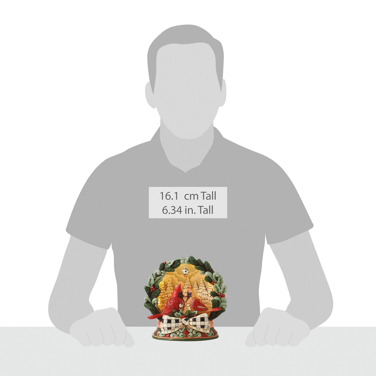 With LED lights, this Highland Glen bird's nest diorama by Jim Shore is a song of color of craftsmanship. Nestled between a wreath brimming with holly, two cardinals create a scene of warmth and love. With a forest backdrop, a jingle bell rings.