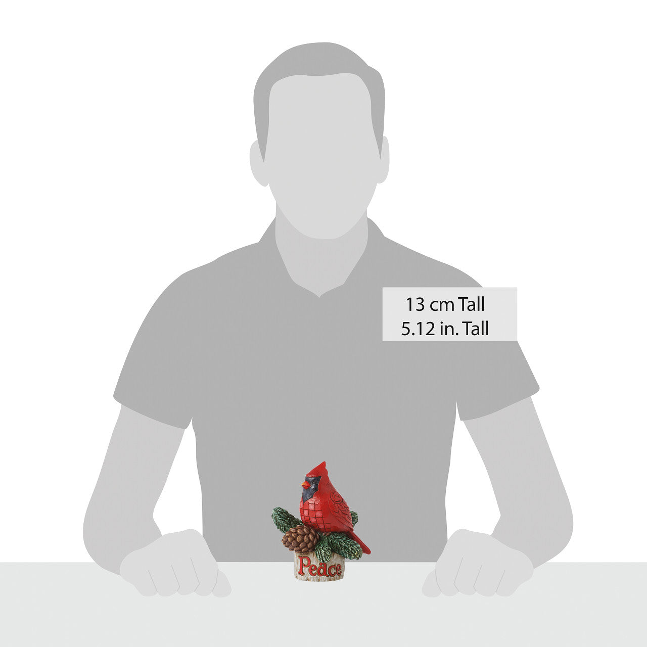 Resting on a birchwood bark stage, a wintertime bird's nest has been constructed from pine needles and a pinecone. Perched on top of the little nest is a lovely cardinal with patchwork plumage. The bird's wooden stage reads Peace in red letters.