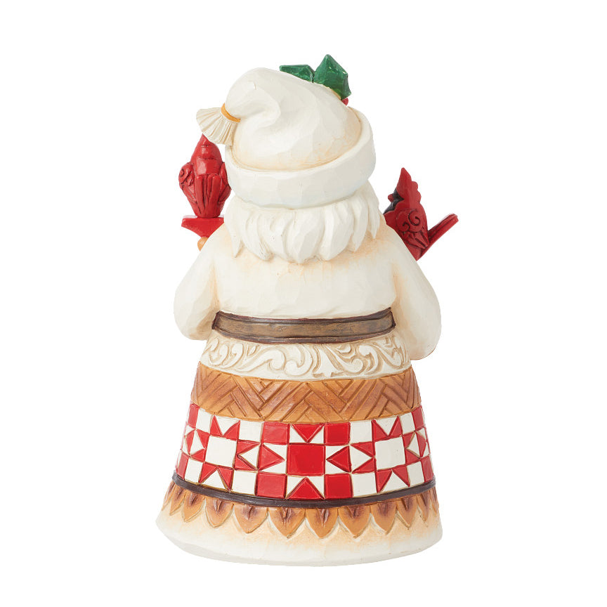 This lighthearted Santa figurine from Jim Shore wears brightly colored robes patterned with red and white patchwork, rosemaling, and green designs. With mistletoe in his hat, Santa holds a red sign that spells Joy with two perching cardinals.