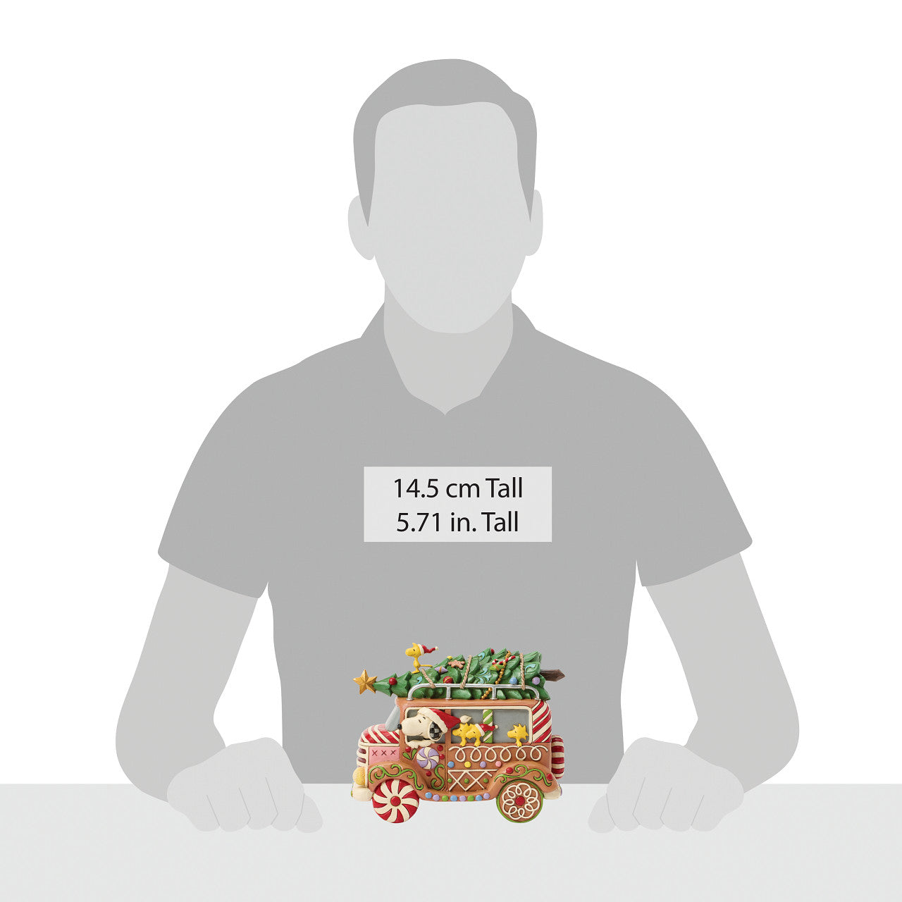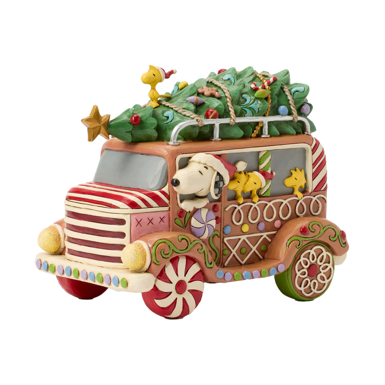 Brighten your holiday season with this playful Jim Shore design of Snoopy driving a festive gingerbread cookie van. Snoopy steers with joy as peppermint wheels spin, while Woodstock rides on the roof with a decorated Christmas tree in tow.