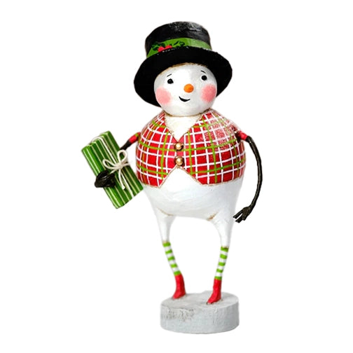 Lori Mitchell's Willy Winter Figurine is a whimsical and charming addition to any Christmas decor collection. This enchanting figurine depicts a snowman wearing a red and green plaid vest, black top hat with green trim and holly berries, and holding a wrapped Christmas present.