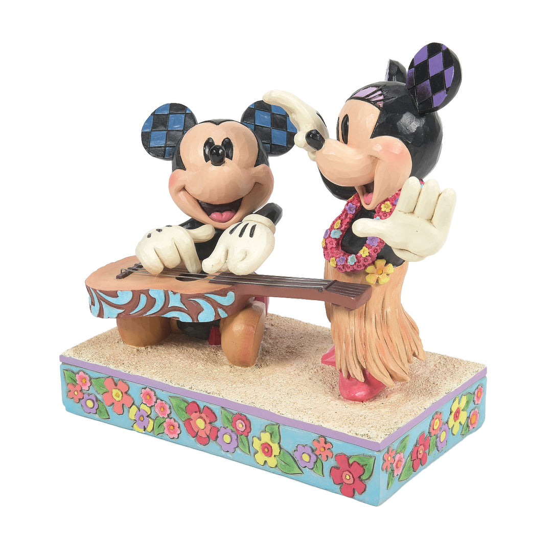 Step into the picturesque beauty of Hawaii with Minnie and Mickey Mouse, as envisioned by the celebrated artist Jim Shore. Amidst the tropical paradise, Mickey serenades with his guitar as Minnie sways in a hula skirt, lovely in their joyous harmony.