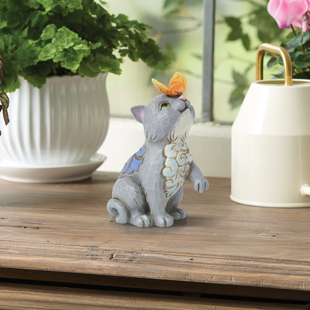 In this whimsical Jim Shore mini figurine, a curious cat with intricate rosemaling details pauses in wonder as a delicate butterfly lands gracefully on its nose. It's a charming moment of unexpected friendship. Add a touch of enchantment to your home.