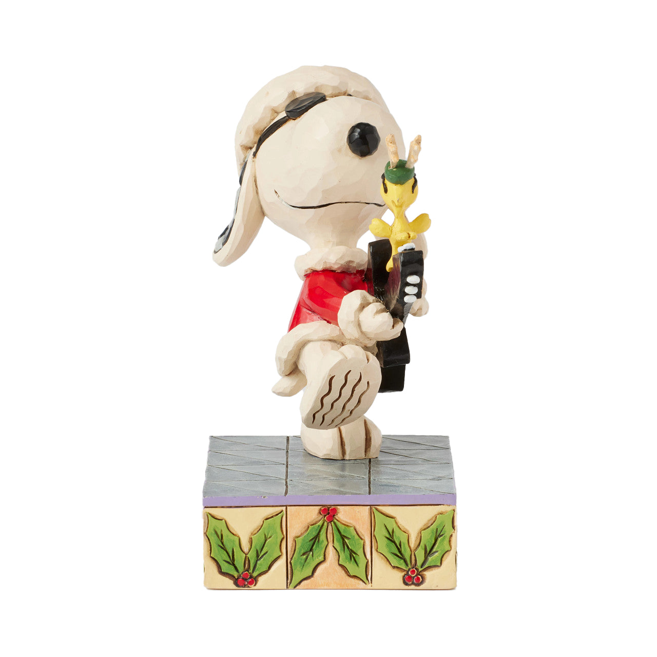 Rock around the Christmas tree with this lively Jim Shore design of Snoopy and Woodstock in full holiday groove. Snoopy sports a Santa hat and sunglasses as he strums an electric guitar coolly, while Woodstock enjoys the show with reindeer antlers.