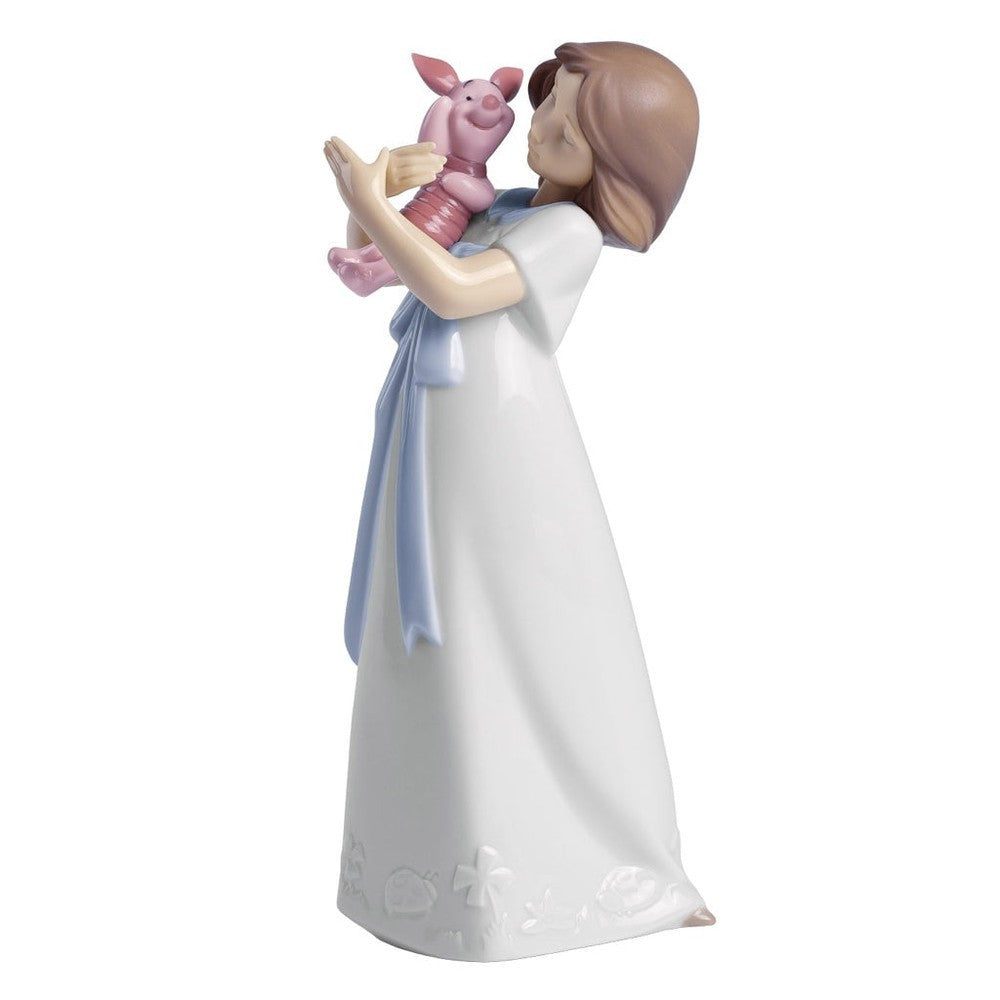This adorable little girl is wearing a long flowing dress adorned with a blue bow. She is cuddling with Piglet, Winnie the Pooh's closest animal friend.