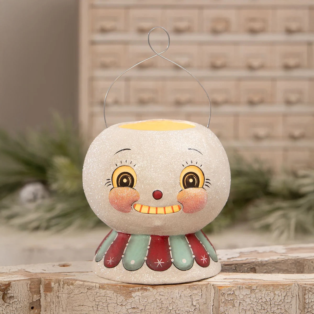 This happy snowman lantern by Johanna Parker, for Bethany Lowe Designs, is the perfect addition to your holiday collection. You can fill him with Christmas treats or add a battery operated light and watch him glow!