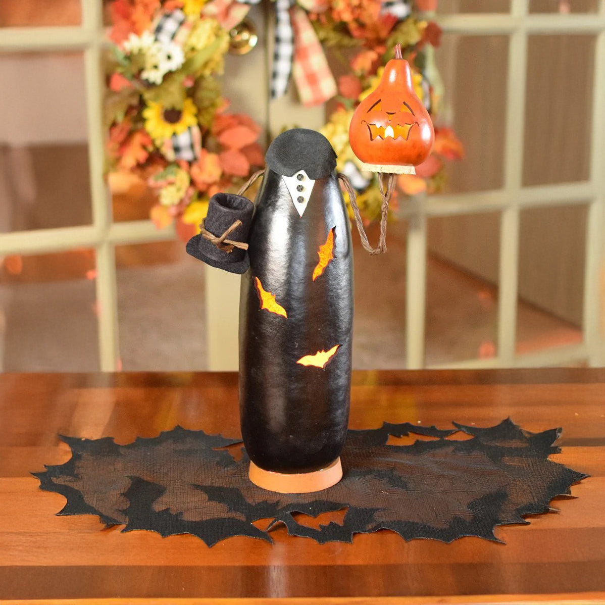 Our Headless Horseman has a black body and is holding his pumpkin head in one arm and his black top hat in the other arm.