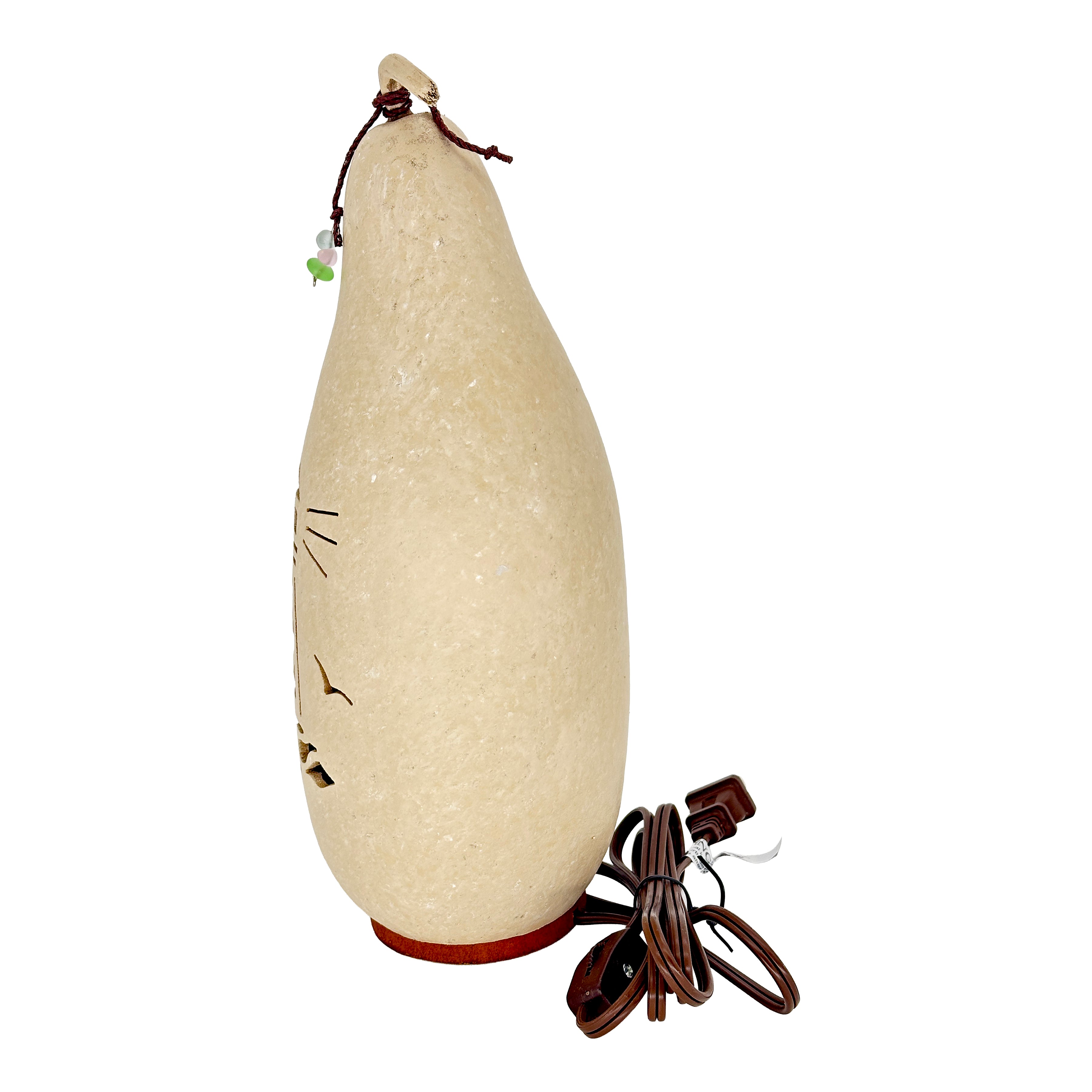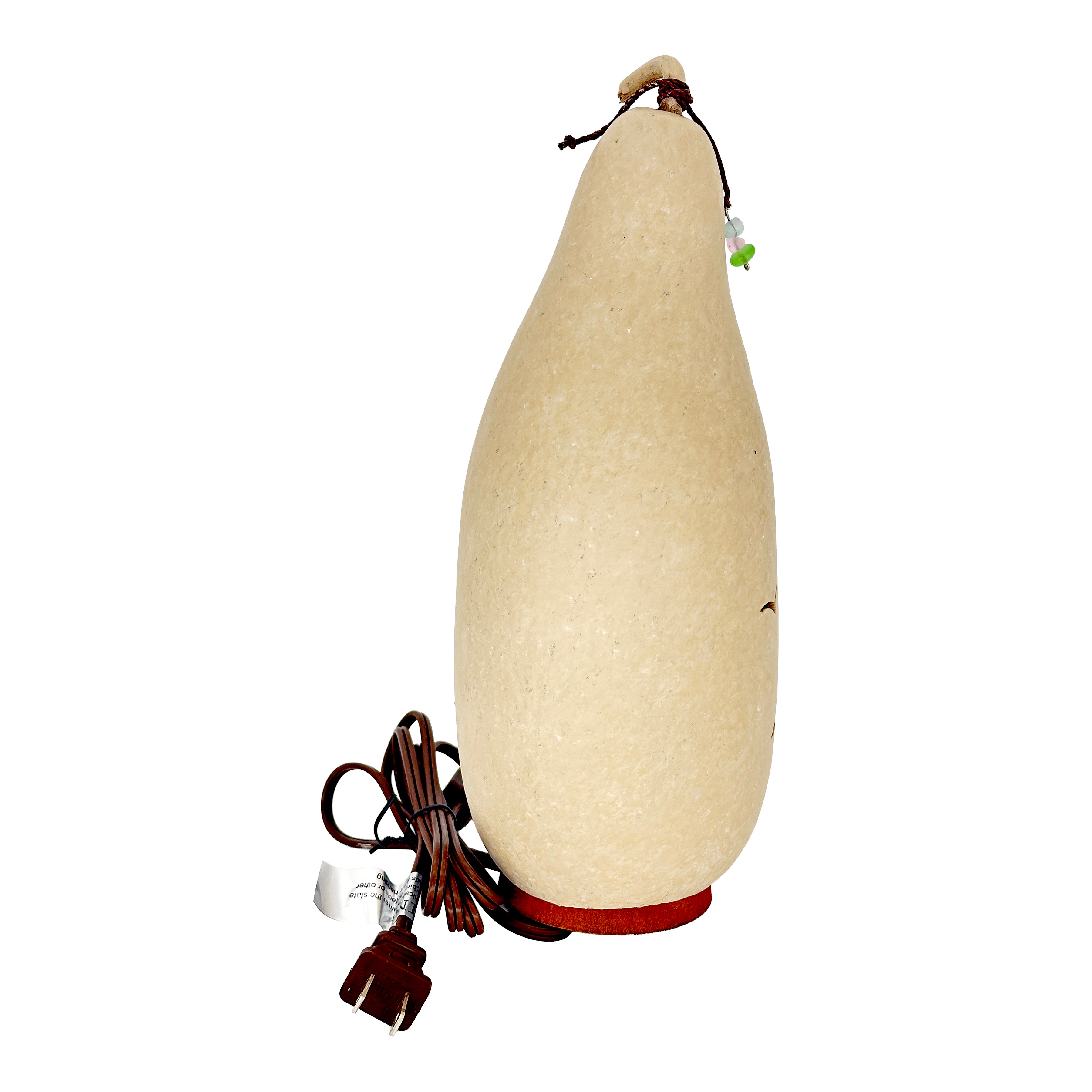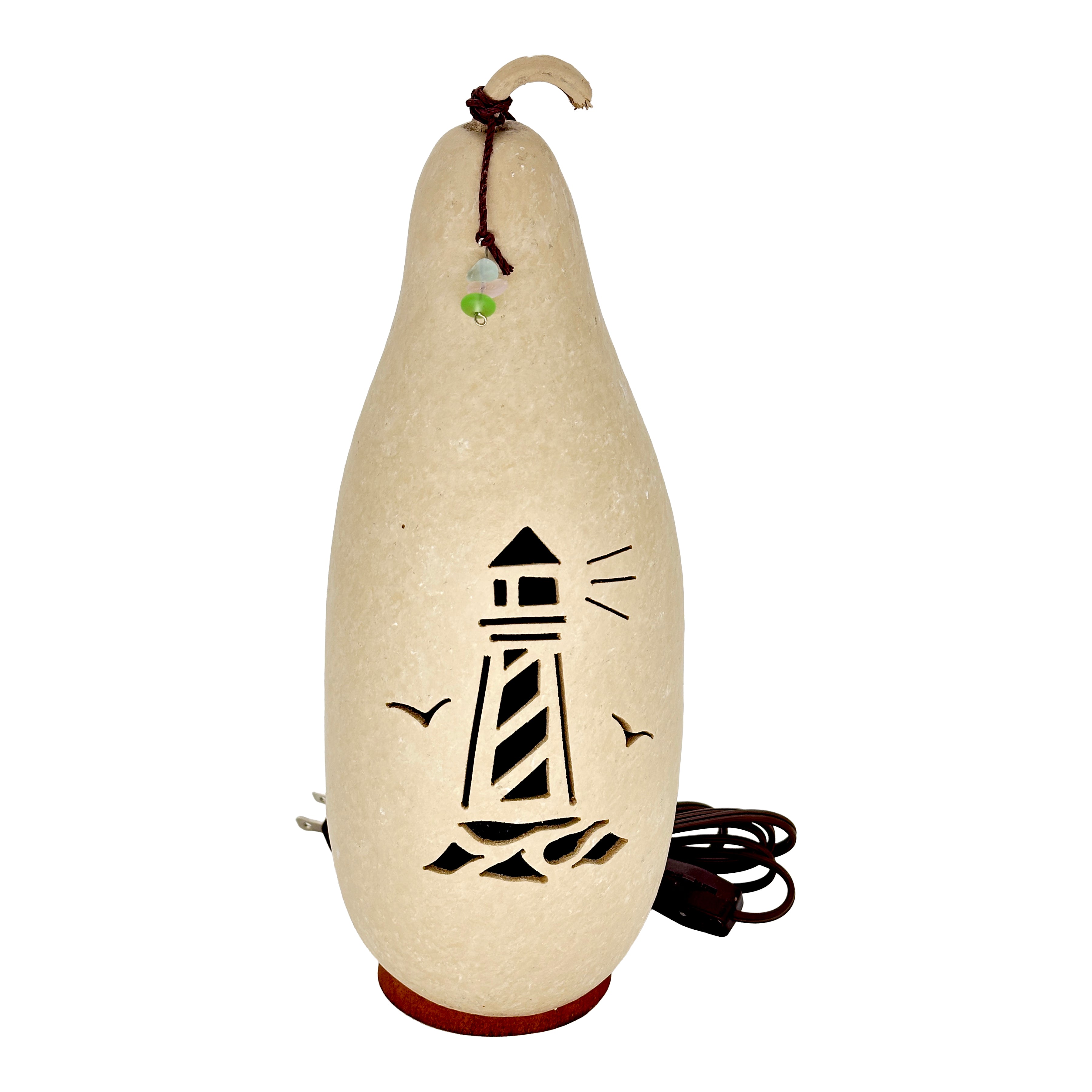 This Lighthouse silhouette gourd luminary is the perfect décor for a natural beach-themed home. The beautifully hand-crafted lighthouse gourd is painted with a unique, textured sand finish and comes with a brown rope attached to the stem. Three different colors of sea glass adorn the rope.