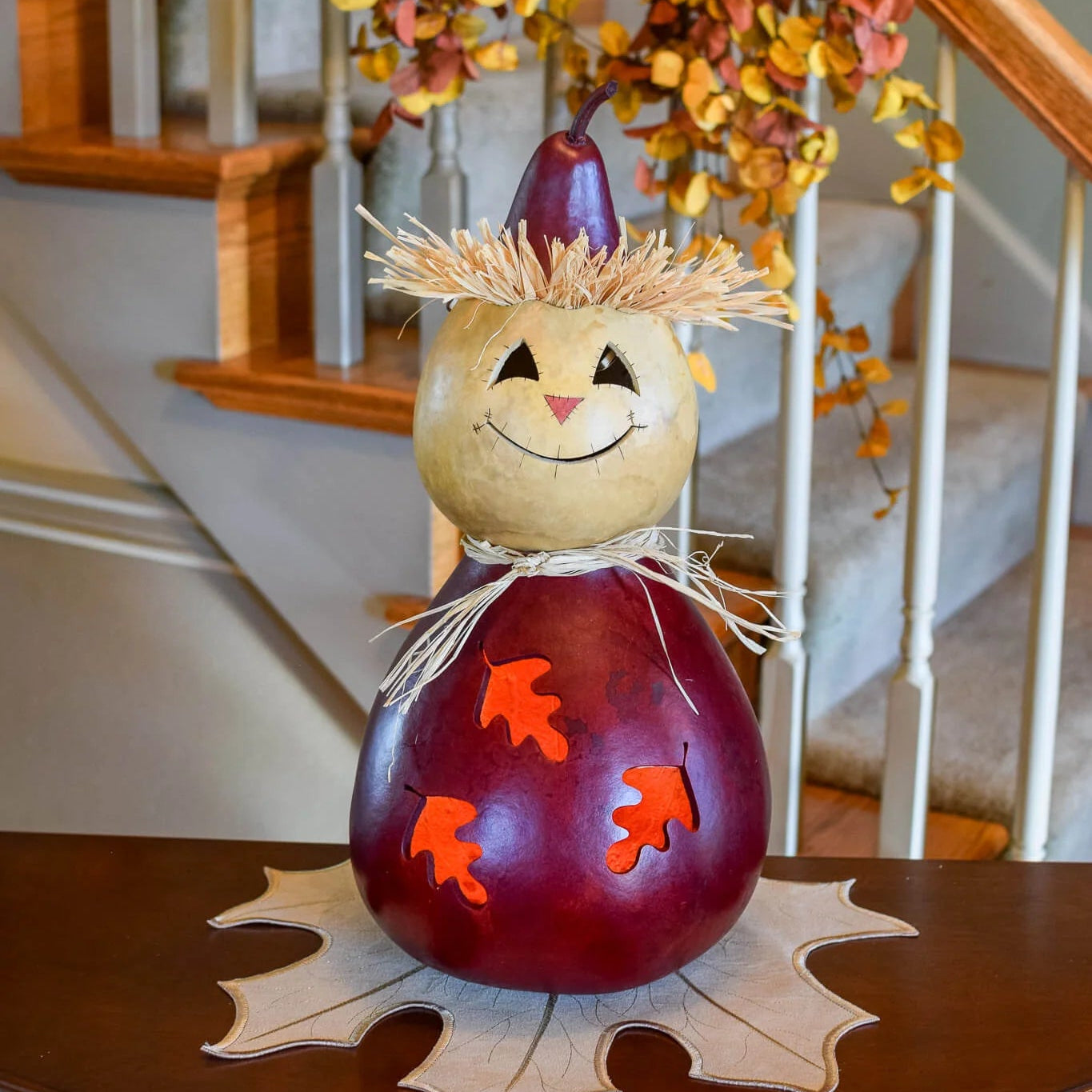 Warehime is our mahogany and natural colored scarecrow. He has three hand crafted leaves and an adorable scarecrow face. His hat is made of a gourd. He has raffia hair and raffia adorns his neck. He is a unique scarecrow that you can leave out all fall season.