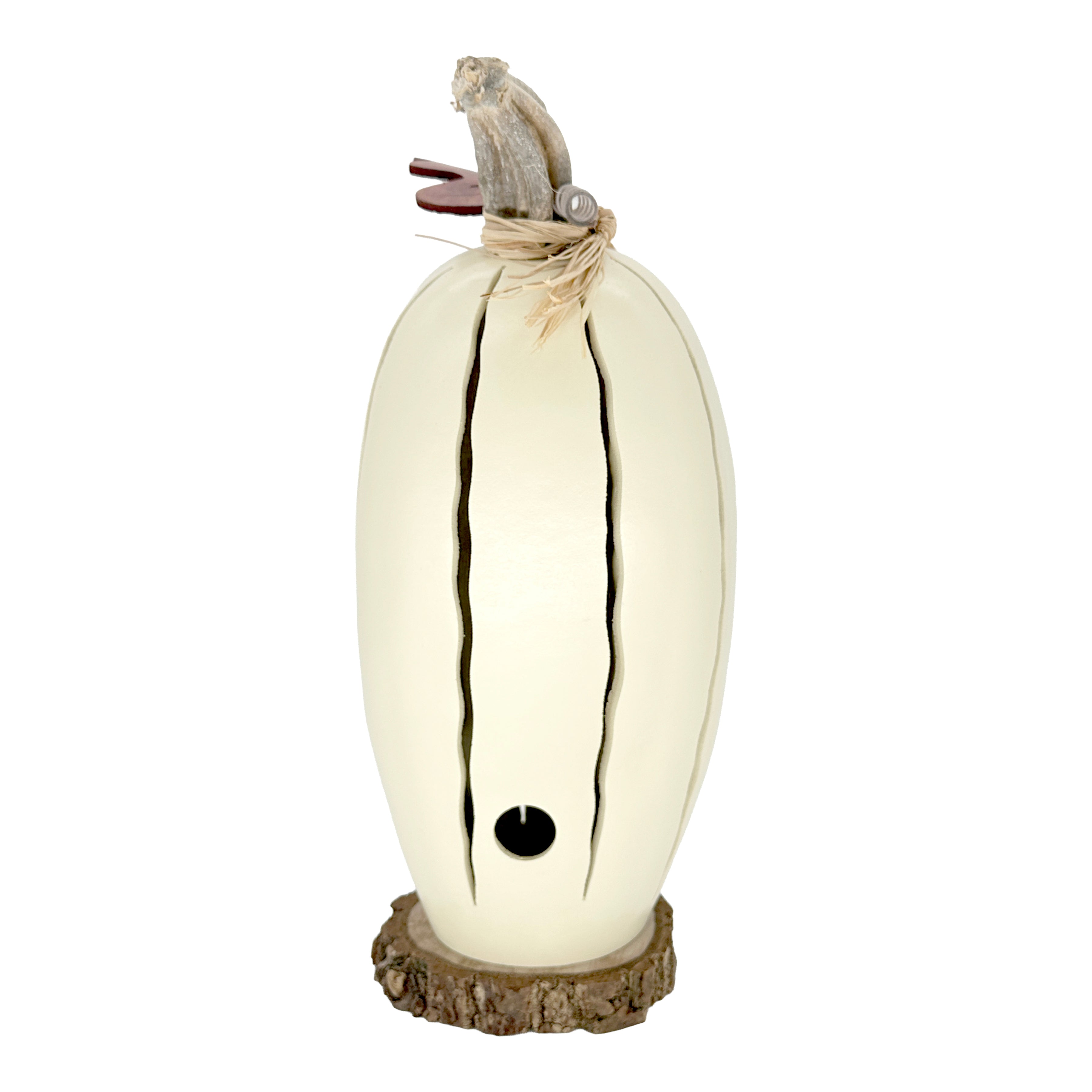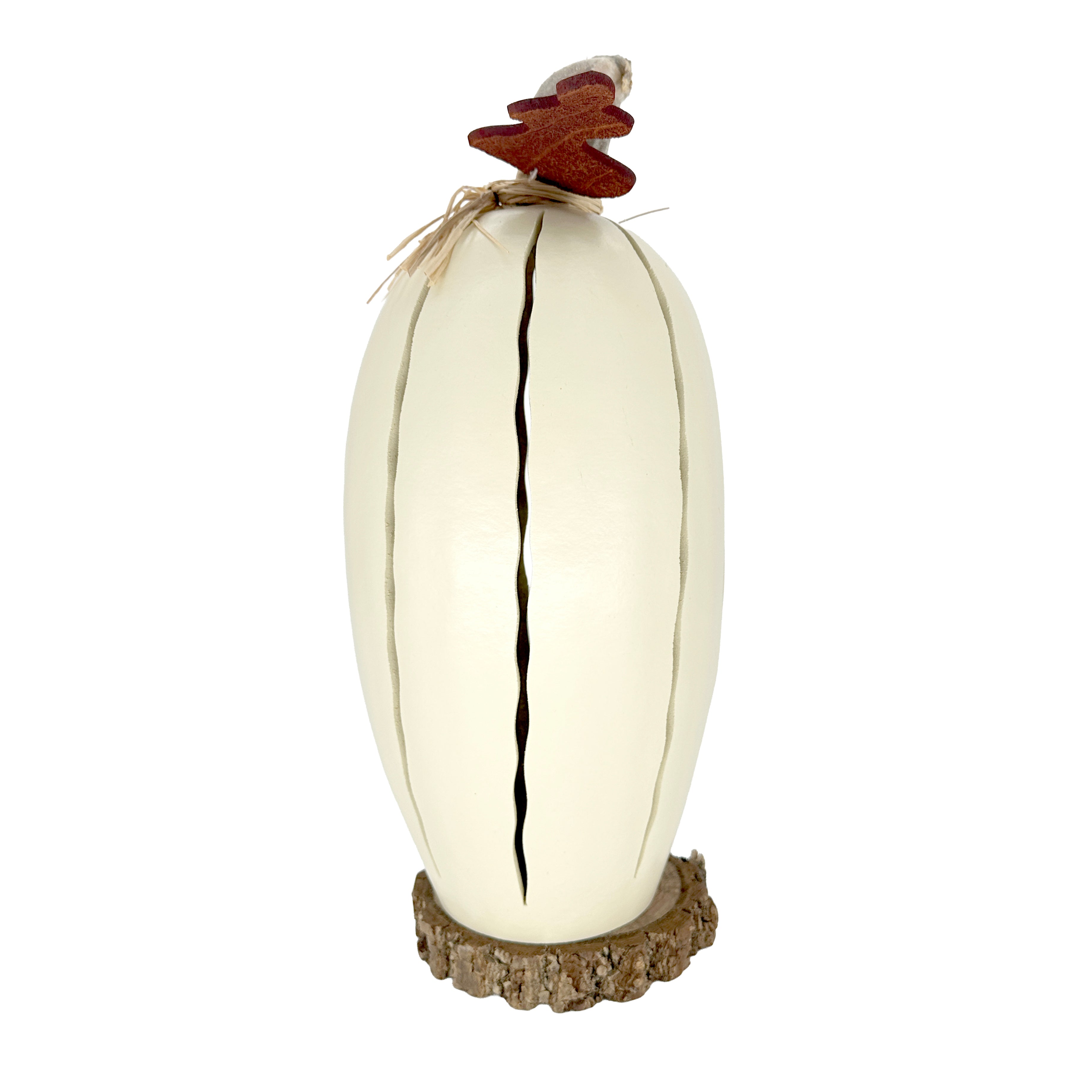 This Pumpkin Luminary gourd is hand-painted white in color and sits on a wood biscuit base. This classic design is a great fall decoration that you can leave out all season long and will last for years to come. It comes with an electric light. The luminary also has a unique pumpkin stem with raffia and an orange gourd leaf.