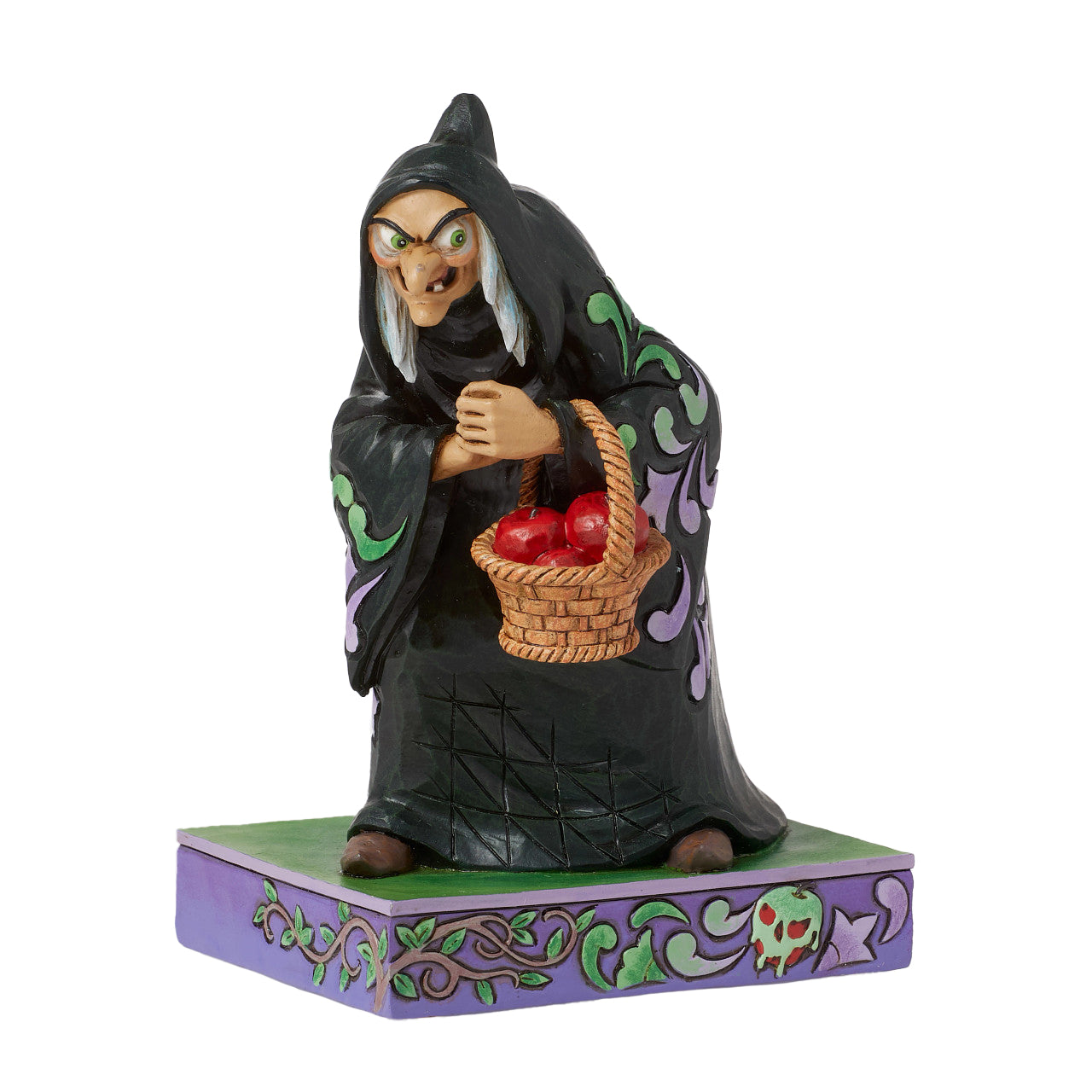 In a sinister guise, the evil witch lurks in the shadows as an elderly woman, her black cloak adorned with vibrant Jim Shore rosemaling, as she carries a basket brimming with poison apples. Her intentions drip with malice and deceit.