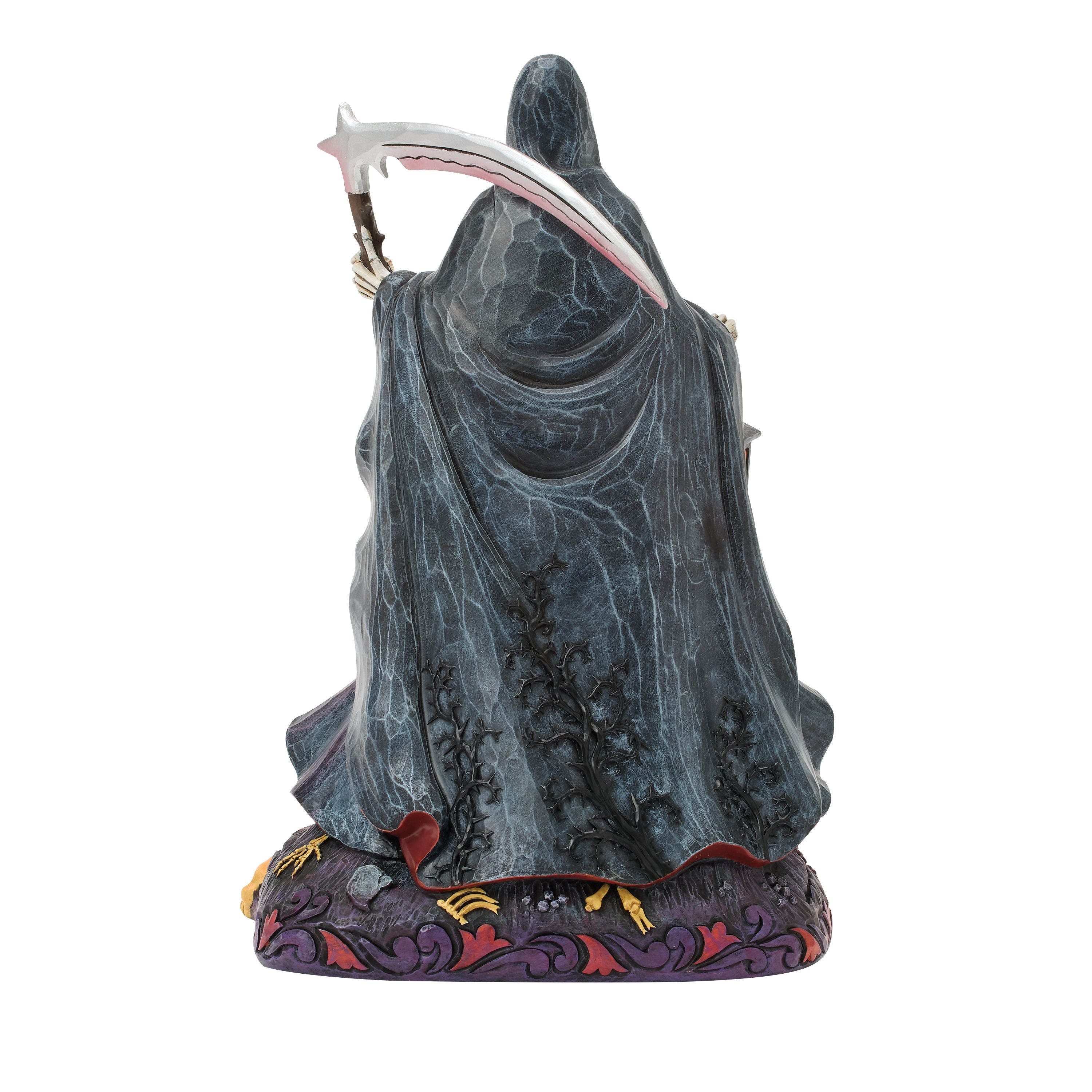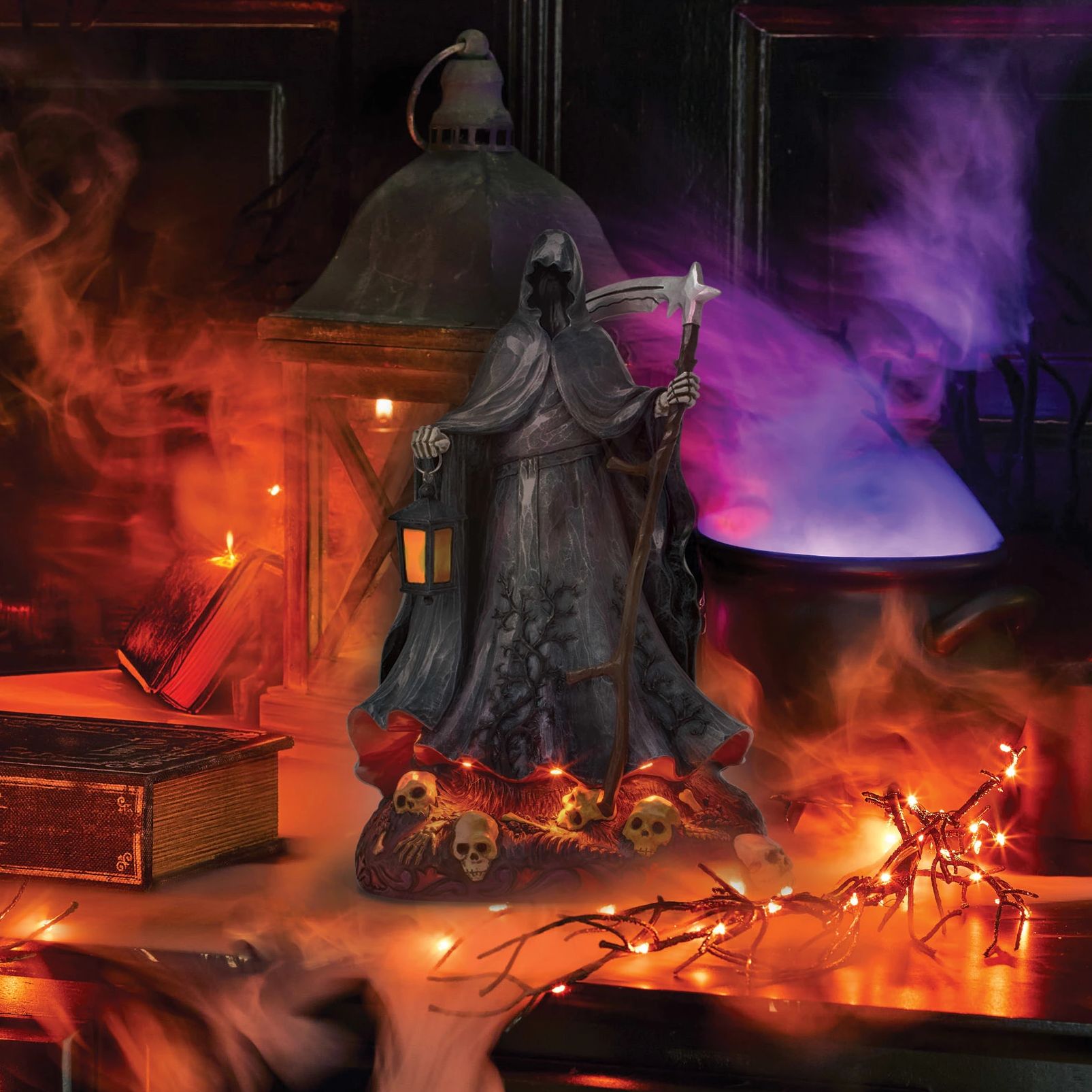 This Jim Shore Grim Reaper is a frightful sight, cloaked in shadows and carrying a gleaming scythe. Skulls and thorns rise from the bone-strewn ground as red LED lights glow beneath his ghostly cape, casting an eerie light on the lantern he holds.