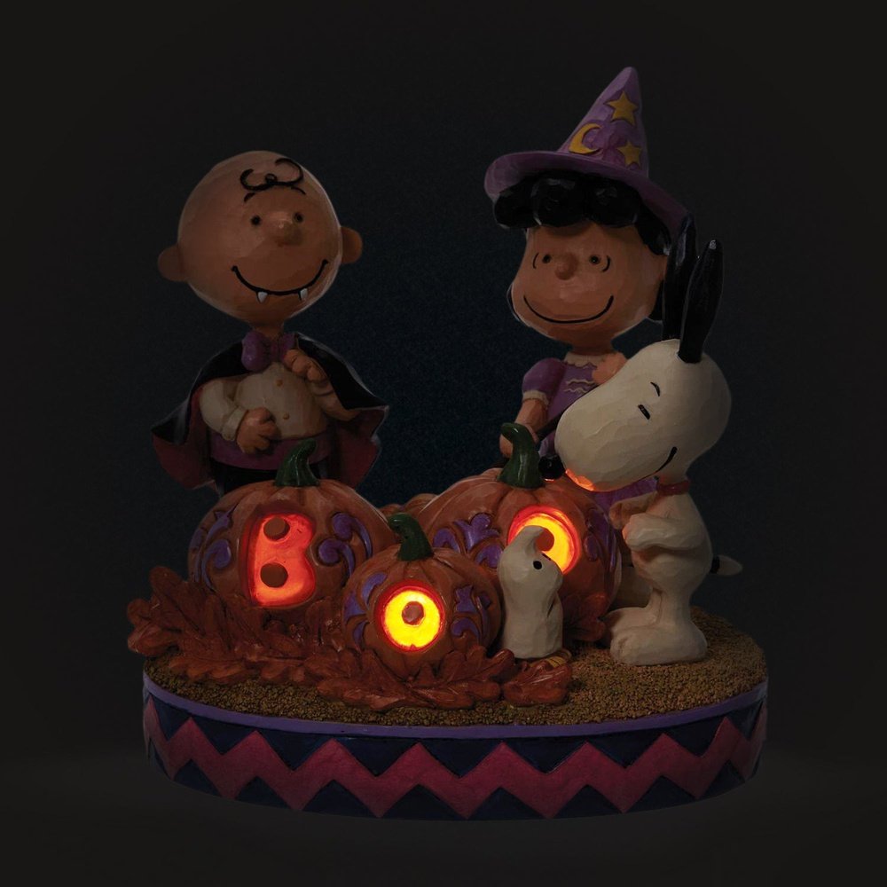 Dressed as the haunted heroes of Halloween, Snoopy is alarmed to see his friends in costume, especially Woodstock who dresses as a spooky specter. Hunting for the great pumpkin, this Jim Shore styled Peanuts statute is delightfully carved boo.