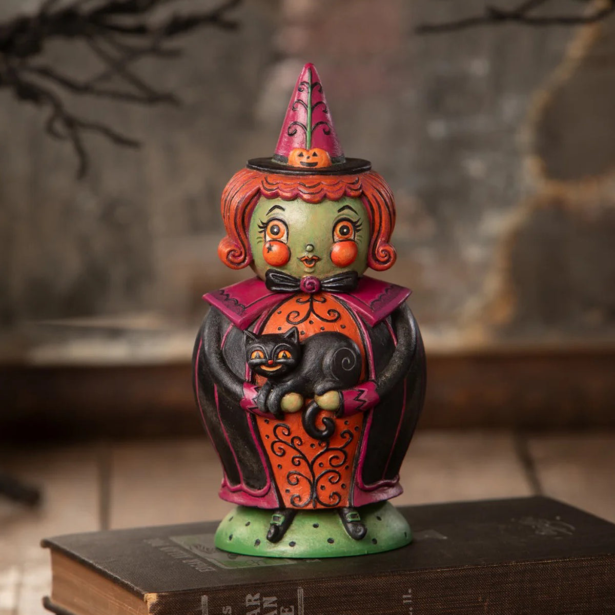 Cast a spell with Johanna Parker’s enchanting Hagatha and Jack Spooks Jar! Dressed in a black cloak with purple accents and an orange dress adorned with vine detailing, Hagatha holds her trusty black cat, Jack. But there's more magic—Hagatha’s head lifts off to reveal a hidden container inside! Perfect for storing little treats or adding a touch of spooky charm to your Halloween decor, this bewitching piece is a delightful way to celebrate the season.