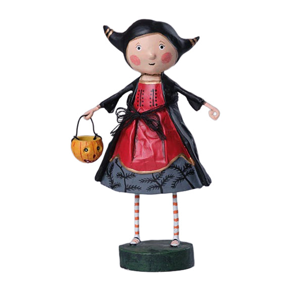 Lori Mitchell's Veronica Vampire Figurine is a whimsical and charming addition to any Halloween decor collection. This enchanting figurine depicts a little girl wearing a red and black victorian dress with black ribbon around her waist. Her black hair is up in two pints (like fangs) with gold bands. She holds a trick-or-treat basket ready for a Halloween night.