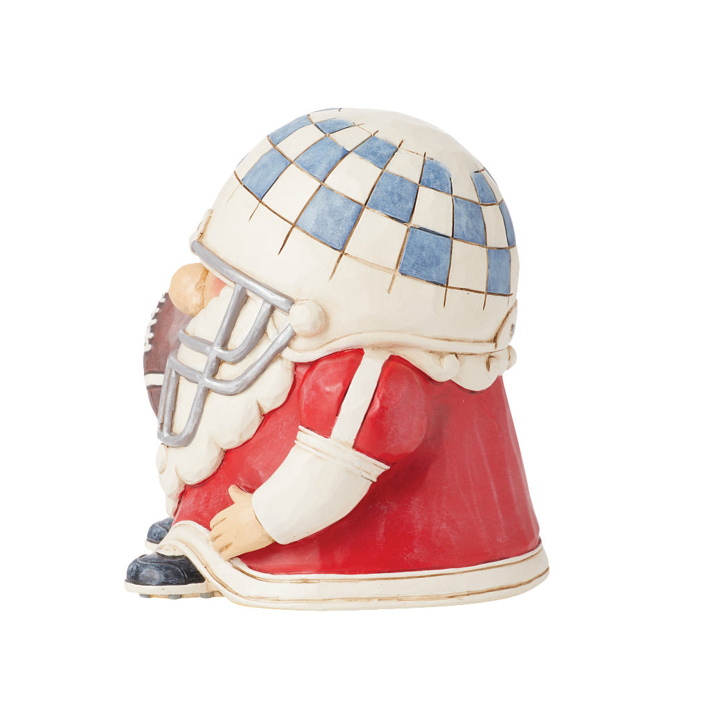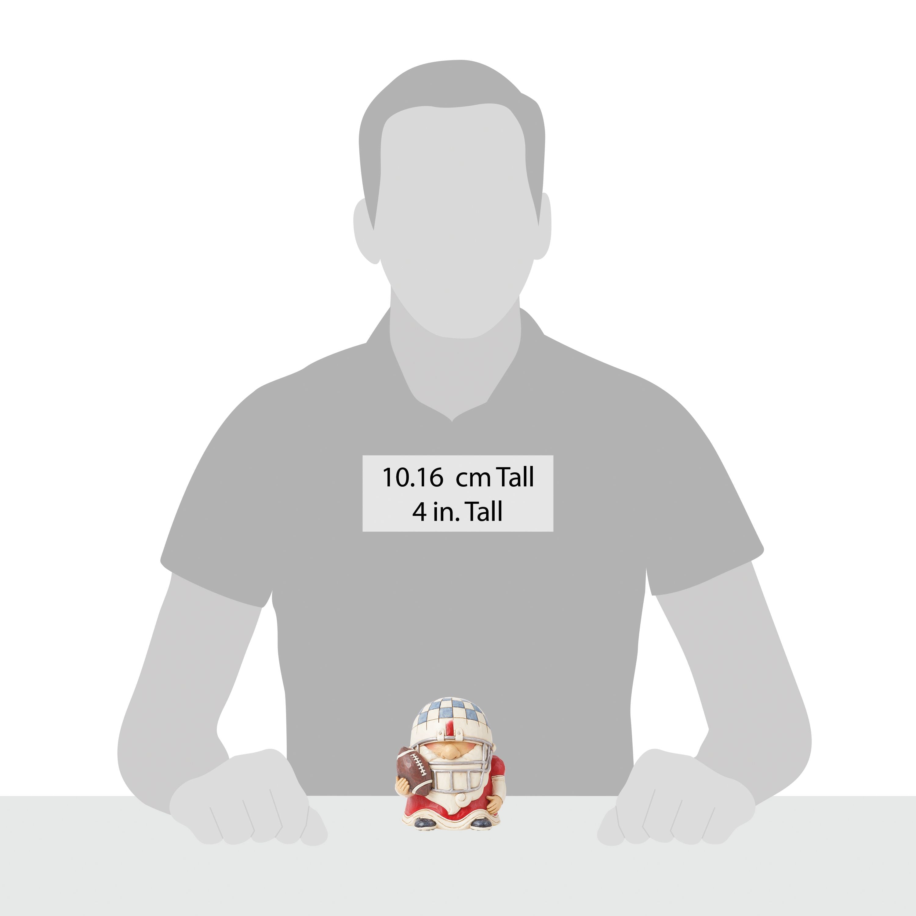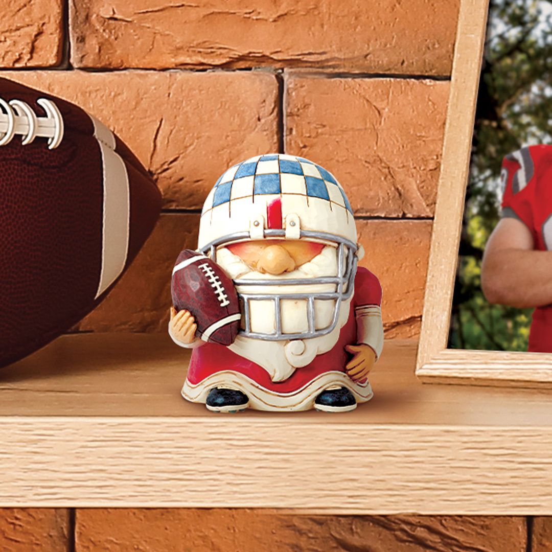This playful collectible from Jim Shore celebrates the love of sports! Bring the competition on with this football player who wears decorated protective gear and a carries a football. With a supportive pennant, he's ready to score touchdowns and encourag