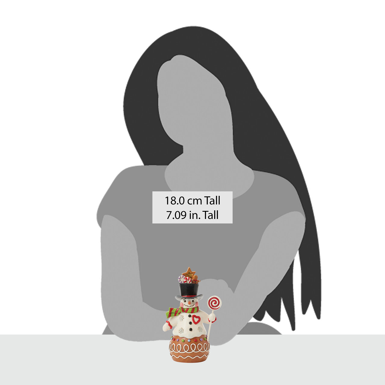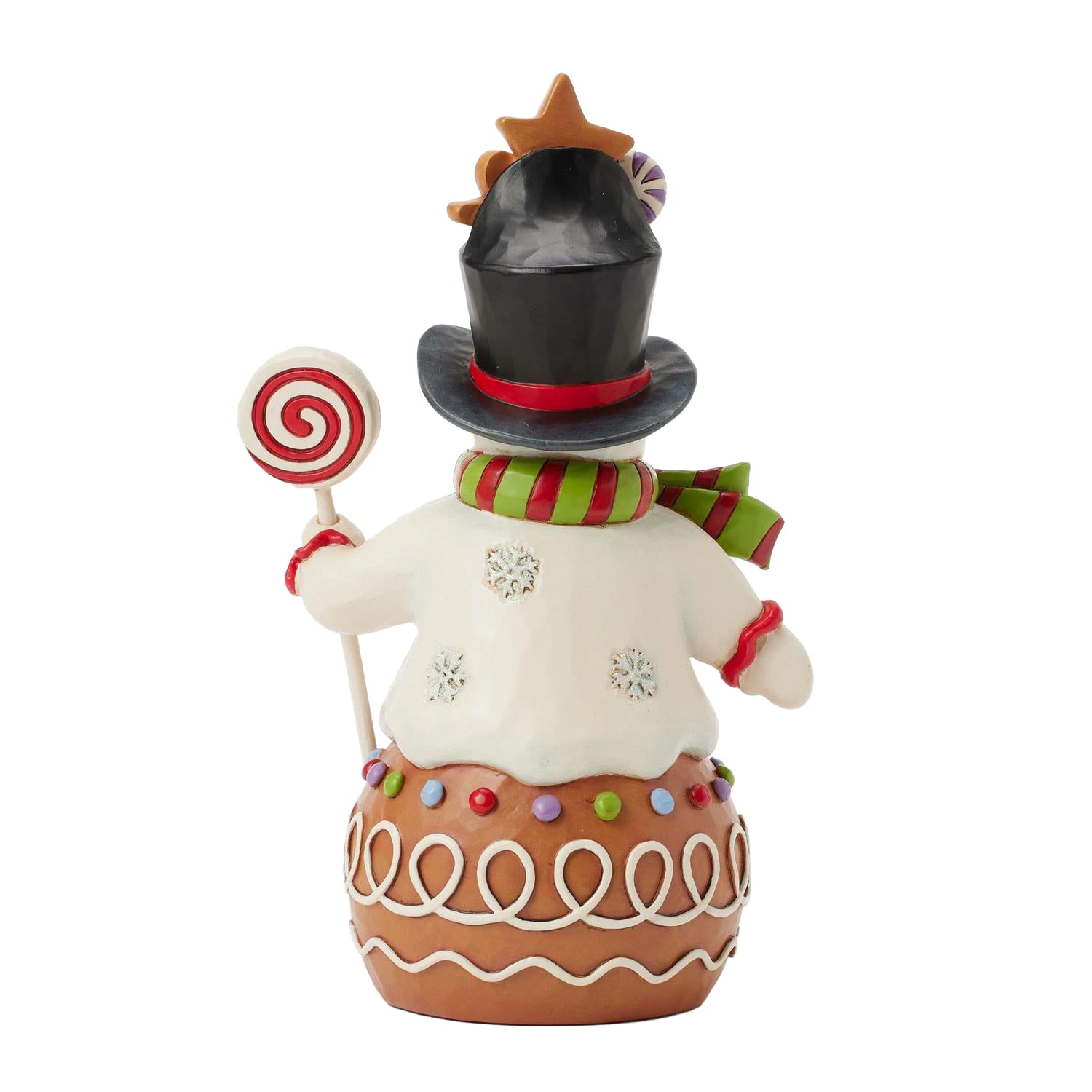 This charming Jim Shore Gingerbread Christmas snowman is too sweet to resist, with icing and candy details decorating his deliciously festive form. Smiling warmly beneath a top hat brimming with sweets, this piece adds a playful touch to your holiday decor.