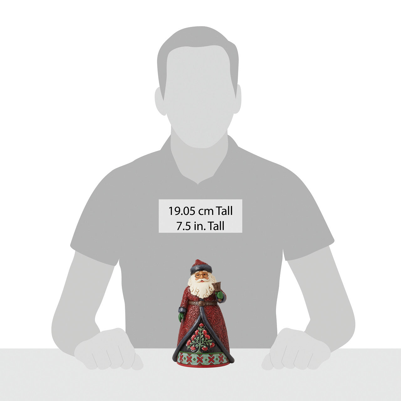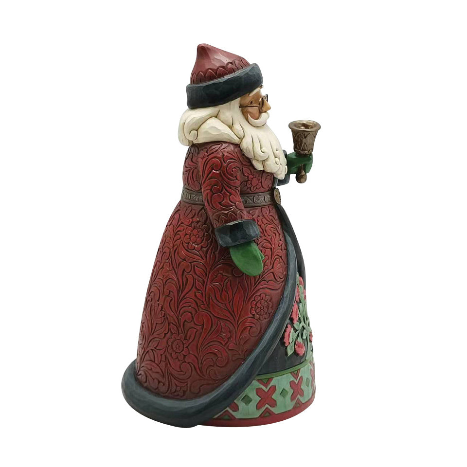 With a bell, this lavish Holiday Manor Santa dons regal red robes with enchanting rosemaling details fitted with a belt. His cloak reveals a dazzling floral scene framed with delightful patterning. With a smile, this Jim Shore Santa rings in the holiday.