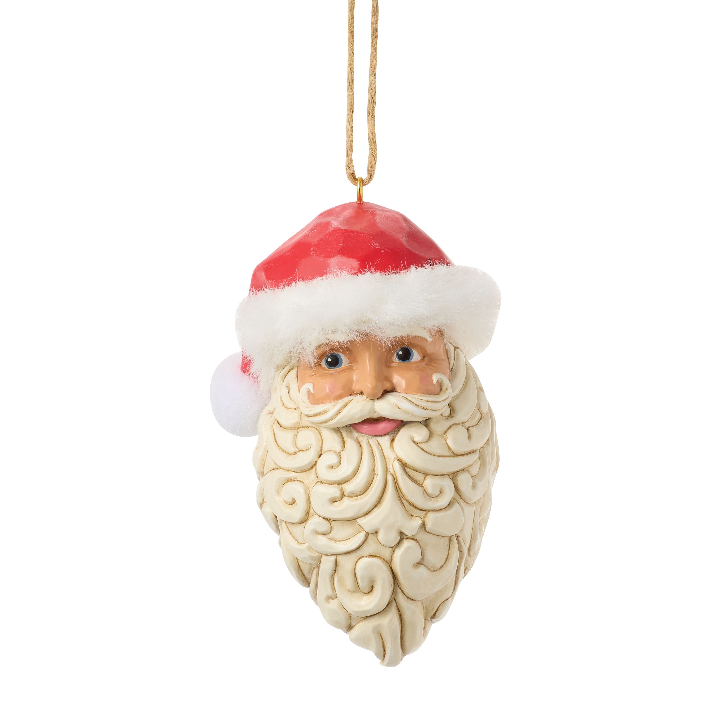 This ornament features Santa's jolly face with nostalgic, vintage style. His beard curls as his cheeks rose. Jim Shore's detailing brings the warmth of good, old-fashioned Christmas to life. A festive nod to classic holiday decor.