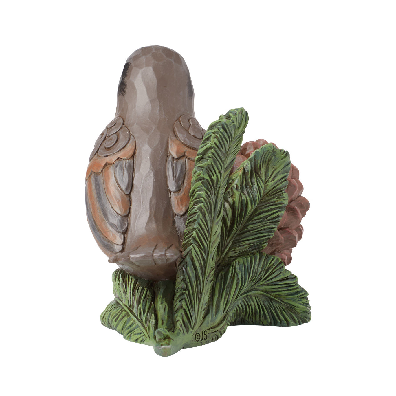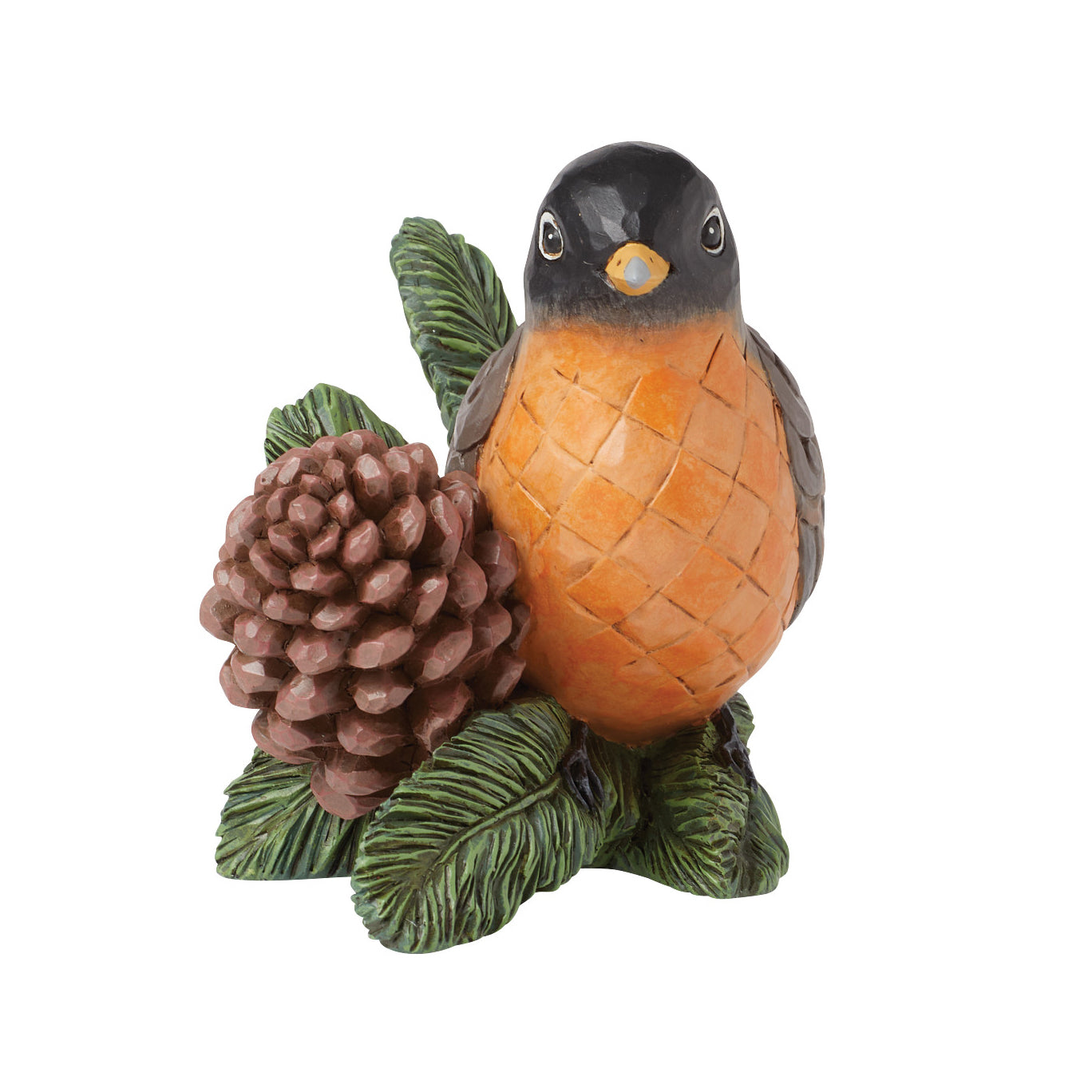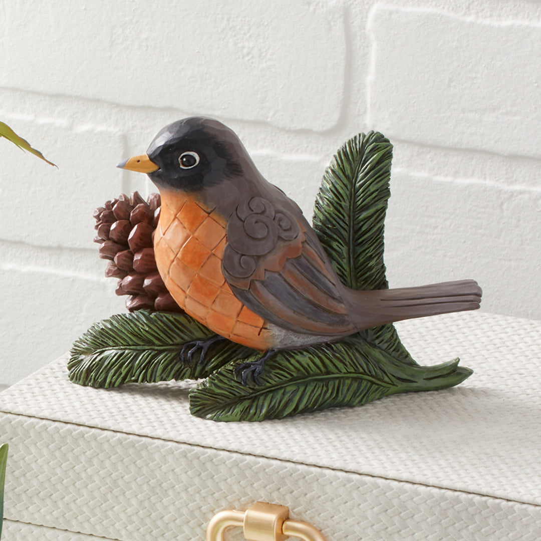 Experience nature's beauty with this striking Jim Shore piece of a serene Robin perched on a pine twig beside a pinecone. Adorned with checkered patterning on its belly and intricate rosemaling on its wing, it captures avian grace in stunning detail.