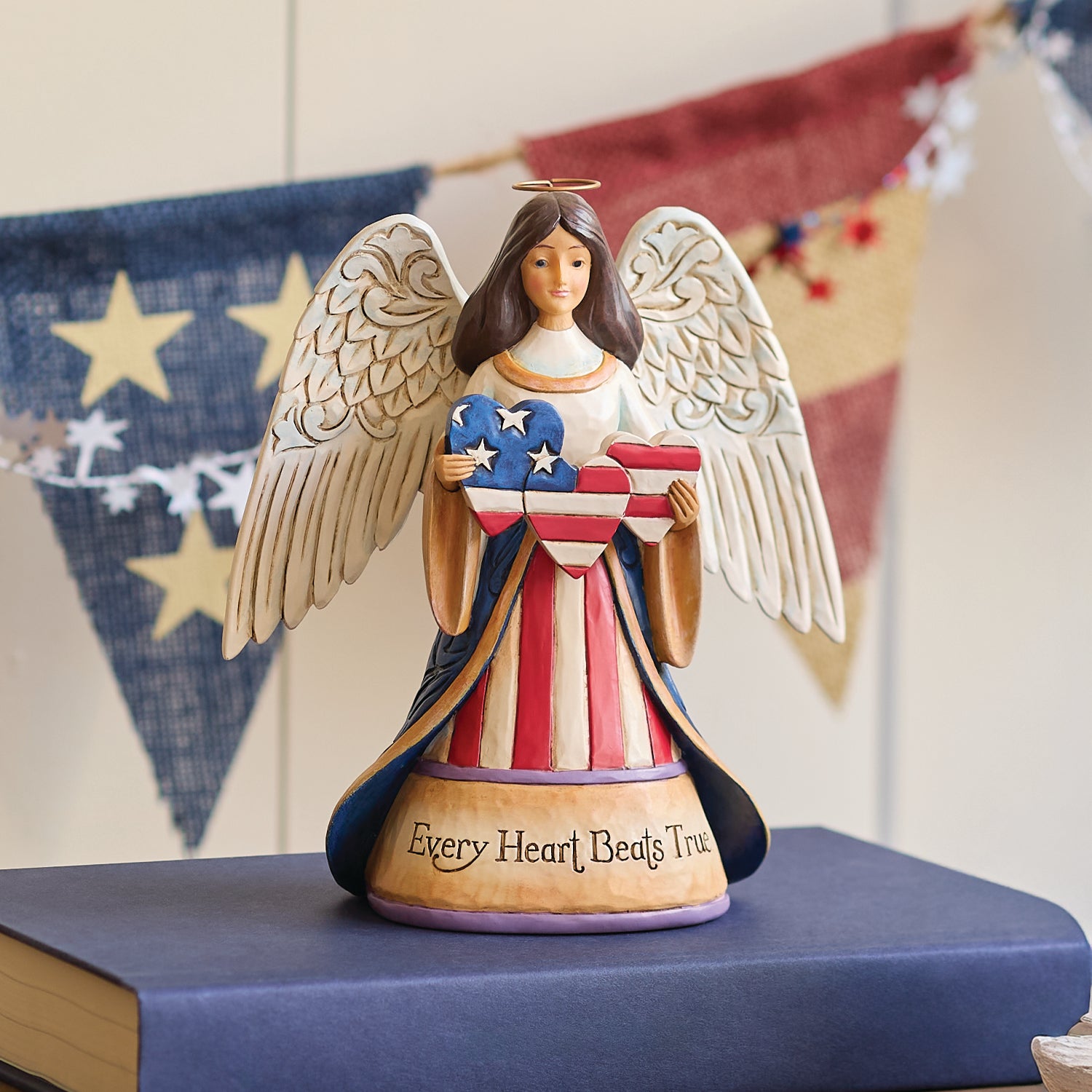 This beautifully crafted Jim Shore angel brings protection and blessings to America. Dressed in red, white, and blue, she holds three star-spangled hearts and she stands with love and grace for all people.