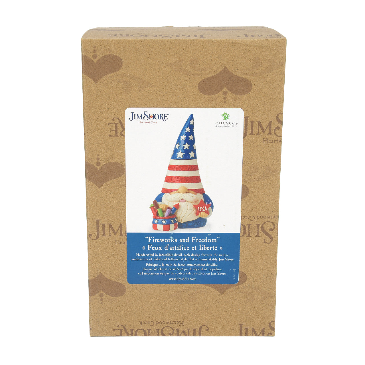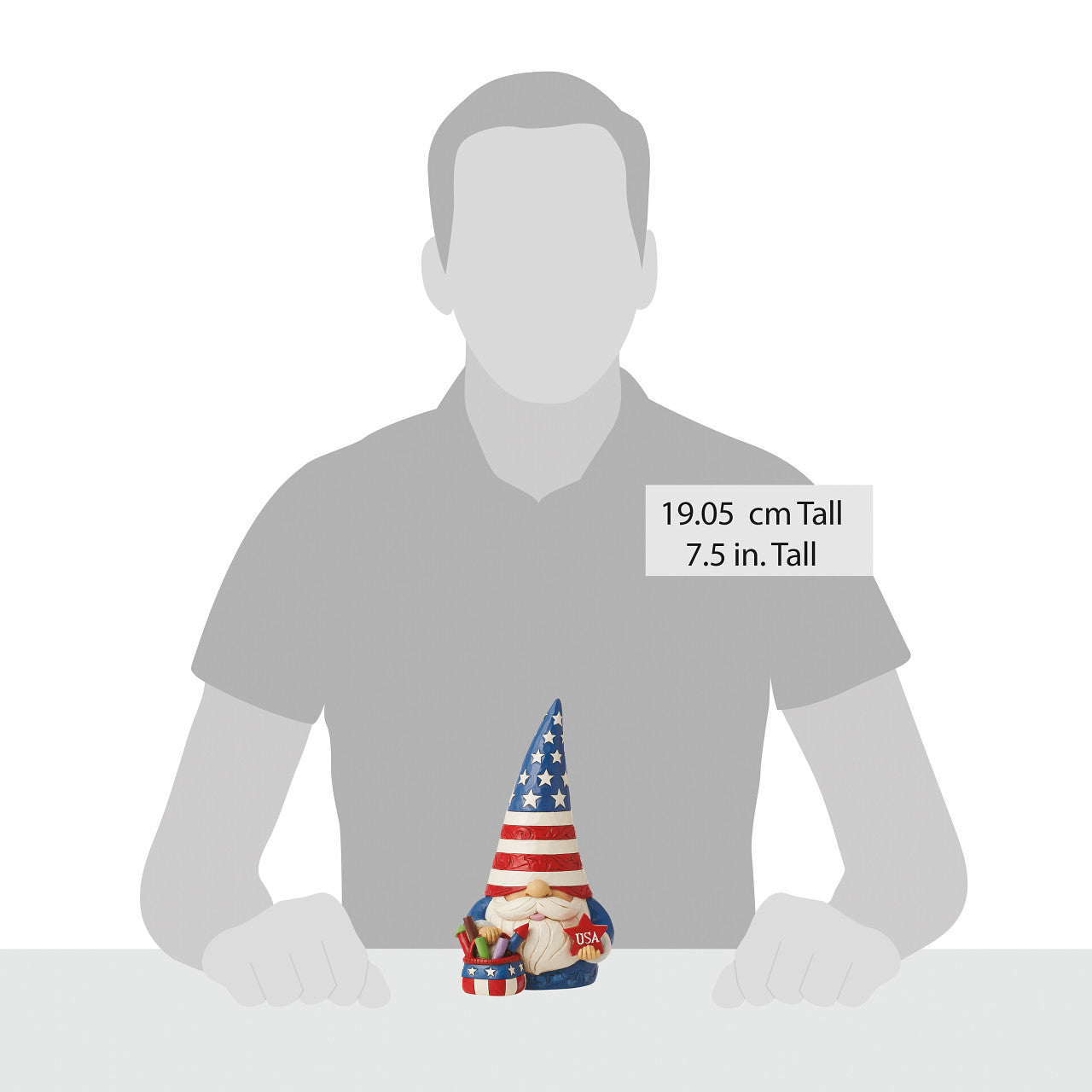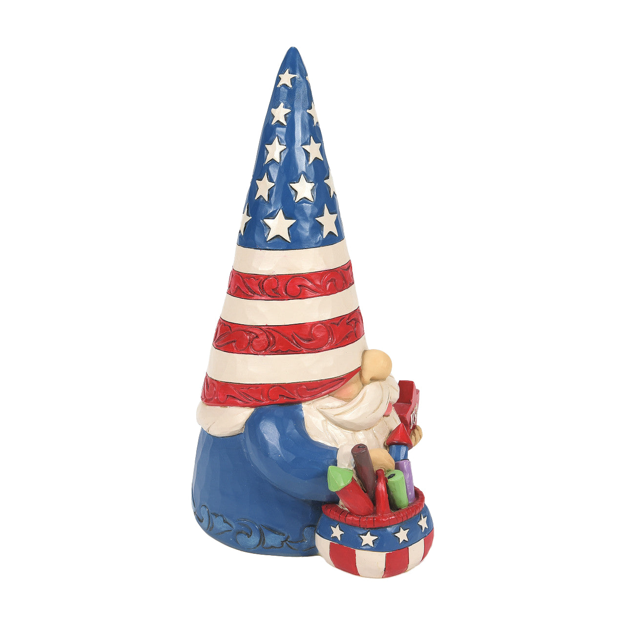 This all American gnome is a vision of red, white, and blue. With a basket of fireworks and patriotic pride, this friendly garden guardian celebrates the stars and stripes with style. Standing tall, this Jim Shore gnome celebrates liberty.