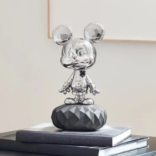 Mickey Mouse, the most famous character from the Disney factory, is recreated in porcelain with a metallic finish. Mickey’s body is decorated with a shiny platinum luster, on which we can see a black flower in porcelain, handcrafted petal by petal. The piece rests on a black porcelain base with a design of geometric facets. The metal effect and matte black porcelain combine to create this new version of one of the best-loved icons in popular culture.