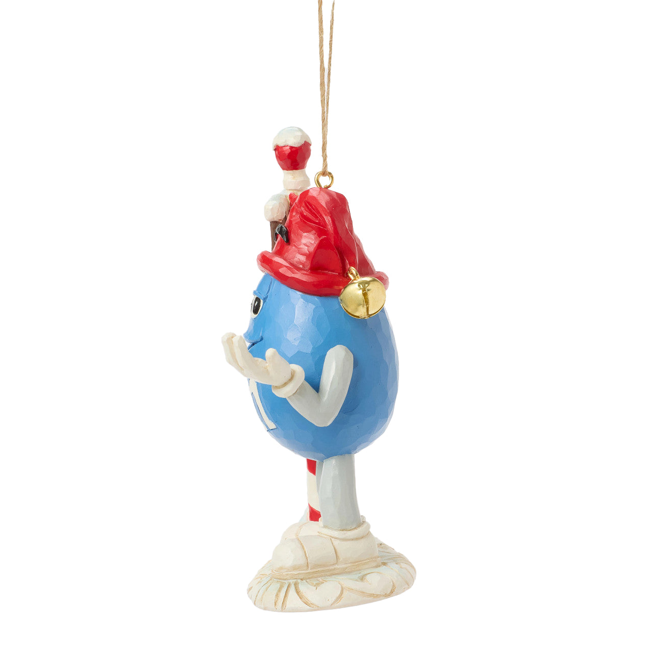 Add a touch of fun to your holiday decor with this Jim Shore ornament featuring M&M's Blue Character standing with the North Pole sign. Wearing an elf hat and sporting a playful expression, he brings cheeky charm to your tree!